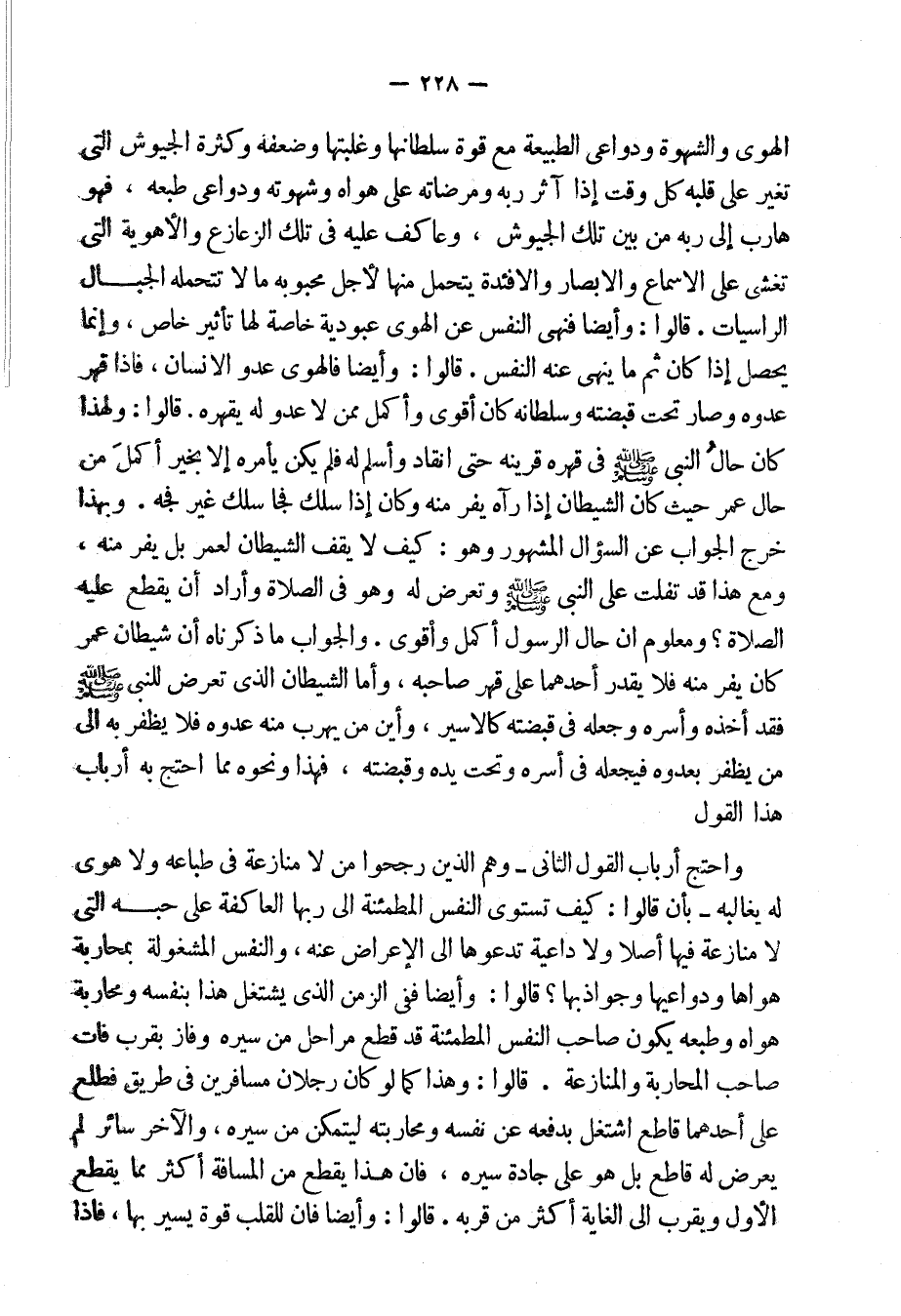 واحتج أَرباب القول الثانى- وهم الذين رجحوا من لا منازعة فى طباعه ولا هوى له يغالبه- بأَن قالوا: كيف تستوى النفس المطمئنة إلى ربها العاكفة على حبه التى لا منازعة فيها أصلاً ولا داعية تدعوها إلى الإعراض عنه، والنفس المشغولة بمحاربة هواها ودواعيها وجواذبها؟ قالوا: وأيضاً ففى الزمن الذى يشتغل هذا بنفسه ومحاربة هواه وطبعه يكون صاحب النفس المطمئنة قد قطع مراحل من سيره وفاز بقرب فات صاحب المحاربة والمنازعة.