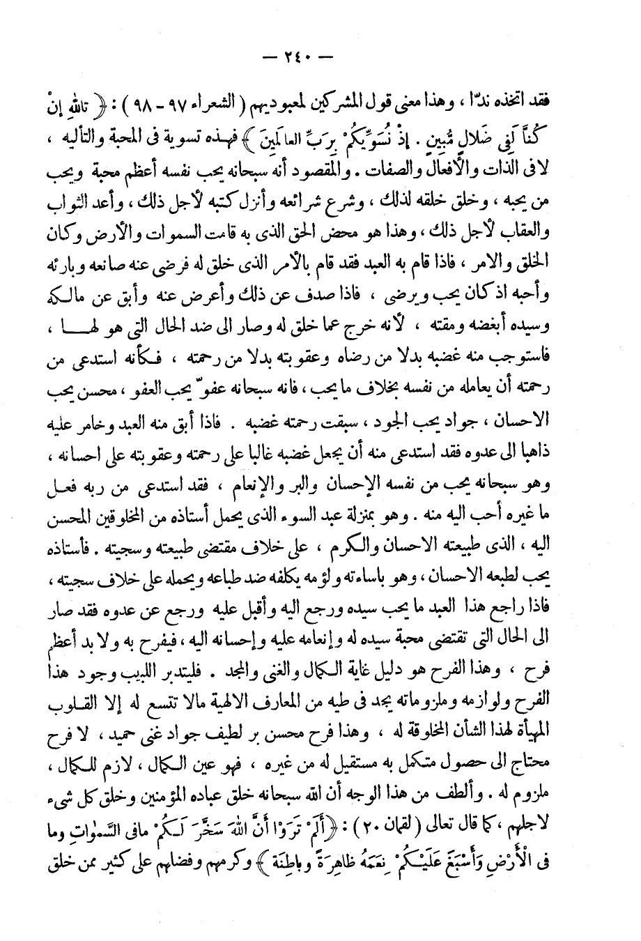 فقد اتخذه نداً، وهذا معنى قول المشركين لمعبوديهم: {تَالله إِن كُنَّا لَفِى ضَلالٍ مُبِينٍ إِذْ نُسَوِّيكُمْ بِرَبِّ الْعَالَمِينَ} [الشعراء: 97- 98] ، فهذه تسوية فى المحبة والتألية، لا فى الذات والأفعال والصفات والمقصود أنه سبحانه يحب نفسه أعظم محبة ويحب من يحبه وخلق خلقه لذلك، وشرع شرائعه وأنزل كتبه لأجل ذلك، وأعد الثواب والعقاب لأجل ذلك، وهذا هو محض الحق الذى به قامت السموات والأرض، وكان الخلق والأمر، فإذا قام به العبد فقد قام بالأمر الذى خلق له فرضى عنه صانعه وبارئه وأحبه إذ كان يحب ويرضى، فإذا صدف عن ذلك وأعرض عنه وأبق عن مالكه وسيده أبغضه ومقته، لأنه خرج عما خلق له وصار إلى ضد الحال التى هو لها، فاستوجب منه غضبه بدلاً من رضاه وعقوبته بدلاً من رحمته، فكأَنه استدعى من رحمته أن يعامله من نفسه بخلاف ما يحب، فإنه سبحانه عفوّ يحب العفو، محسن يحب الإحسان، جواد يحب الجود سبقت رحمته غضبه. فإذا أبق منه العبد وخامر عليه ذاهباً إلى عدوه فقد استدعى منه أن يجعل غضبه غالباً على رحمته وعقوبته على إحسانه، وهو سبحانه يحب من نفسه الإحسان والبر والإنعام، فقد استدعى من ربه فعل ما غيره أحب إليه منه. وهو بمنزلة عبد السوء الذى يحمل أستاذه من المخلوقين المحسن إليه، الذى طبيعته الإحسان والكرم، على خلاف مقتضى طبيعته وسجيته، فأُستاذه يحب لطبعه الإحسان، وهو بإِساءَته ولؤمه يكلفه ضد طباعه ويحمله على خلاف سجيته، فإذا راجع هذا العبد ما يحب سيده [إليه وأقبل عليه وأعرض عن عدوه فقد صار إلى الحال التى تقتضى محبة سيده له] وإنعامه عليه وإحسانه إليه، فيفرح به ولا بد أعظم فرح، وهذا الفرح هو دليل [عليه] غاية الكمال والغنى والمجد.