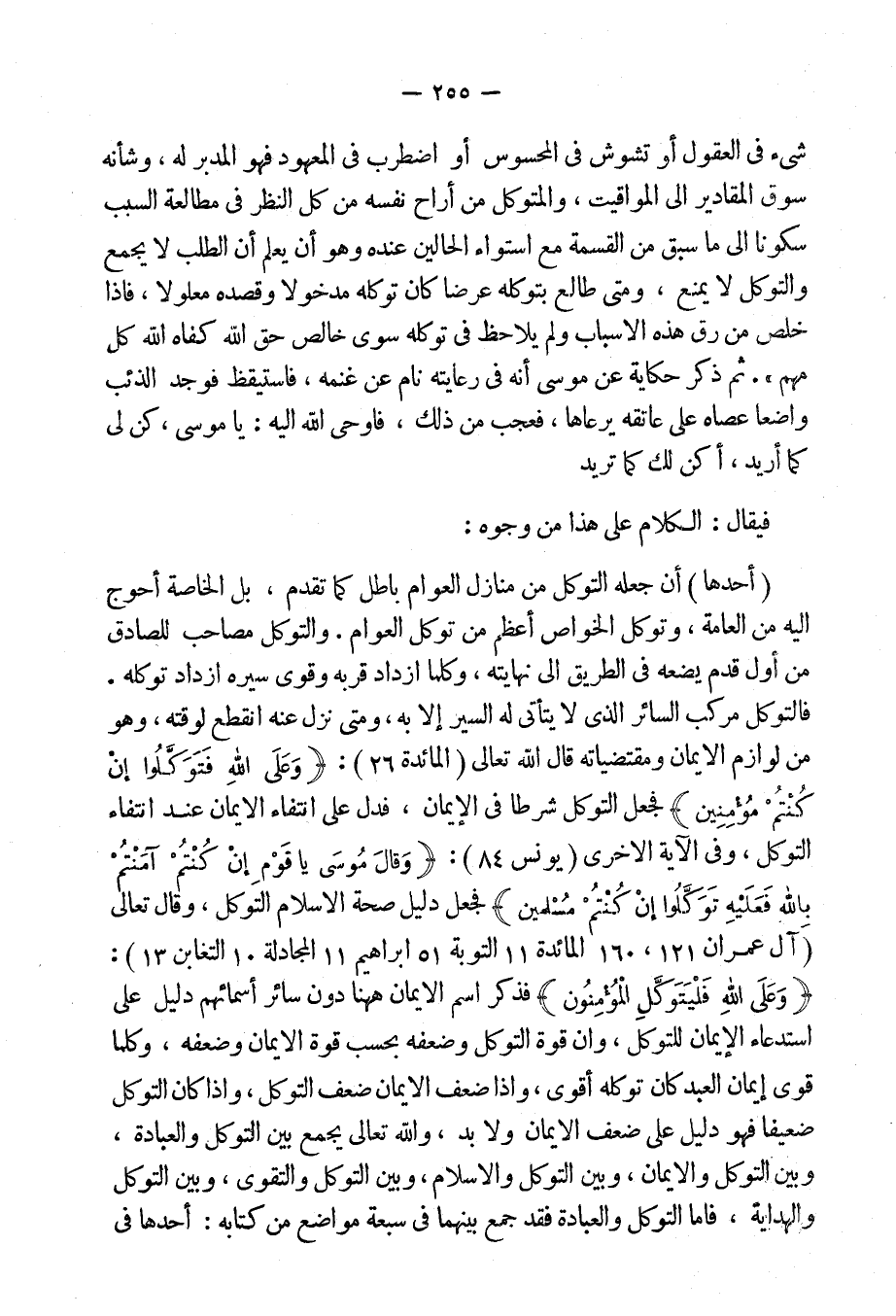 أحدها: إن جعله التوكل من منازل العوام باطل كما تقدم، بل الخاصة أحوج إليه من العامة، وتوكل الخواص أعظم من توكل العوام. والتوكل مصاحب للصادق من أول قدم يضعه فى الطريق إلى نهايته، وكلما ازداد قربه وقوى سيره ازداد توكله. فالتوكل مركب السائر الذى لا يتأتى له السير إلا به، ومتى نزل عنه انقطع لوقته، وهو من لوازم الإيمان ومقتضياته، قال الله تعالى: {وَعَلَى اللهِ فَتَوَكَّلُوا إِنْ كُنْتُمْ مُؤْمِنِينَ} [المائدة: 23] ، فجعل التوكل شرطاً فى الإيمان، فدل على انتفاءِ الإيمان عند انتفاء التوكل، وفى الآية الأُخرى: {وَقَال مُوسَى يَا قَوْمِ إِن كُنتُمْ آمَنتُمْ بِاللهِ فَعَلَيْهِ تَوَكَّلُوا إِن كُنْتُمْ مُسْلِمِين} [يونس: 84] فجعل دليل صحة الإسلام التوكل، وقال تعالى: {وَعَلَى الله فَلْيَتَوَكَّلِ الْمُؤْمِنُونَ} [آل عمران: 122، 160] [المائدة: 11] [التوبة: 51] [إبراهيم: 11] [المجادلة: 10] [التغابن: 13] ، فذكر اسم الإيمان هاهنا دون سائر أسمائهم دليل على استدعاءِ الإيمان للتوكل، وإن قوة التوكل وضعفه بحسب قوة الإيمان وضعفه، وكلما قوى إيمان العبد كان توكله أقوى، وإذا ضعف الإيمان ضعف التوكل، وإذا كان التوكل ضعيفاً، فهو دليل على ضعف الإيمان ولا بد، والله تعالى يجمع بين التوكل والعبادة وبين التوكل والإيمان، وبين التوكل والإسلام، وبين التوكل والتقوى، وبين التوكل والهداية.