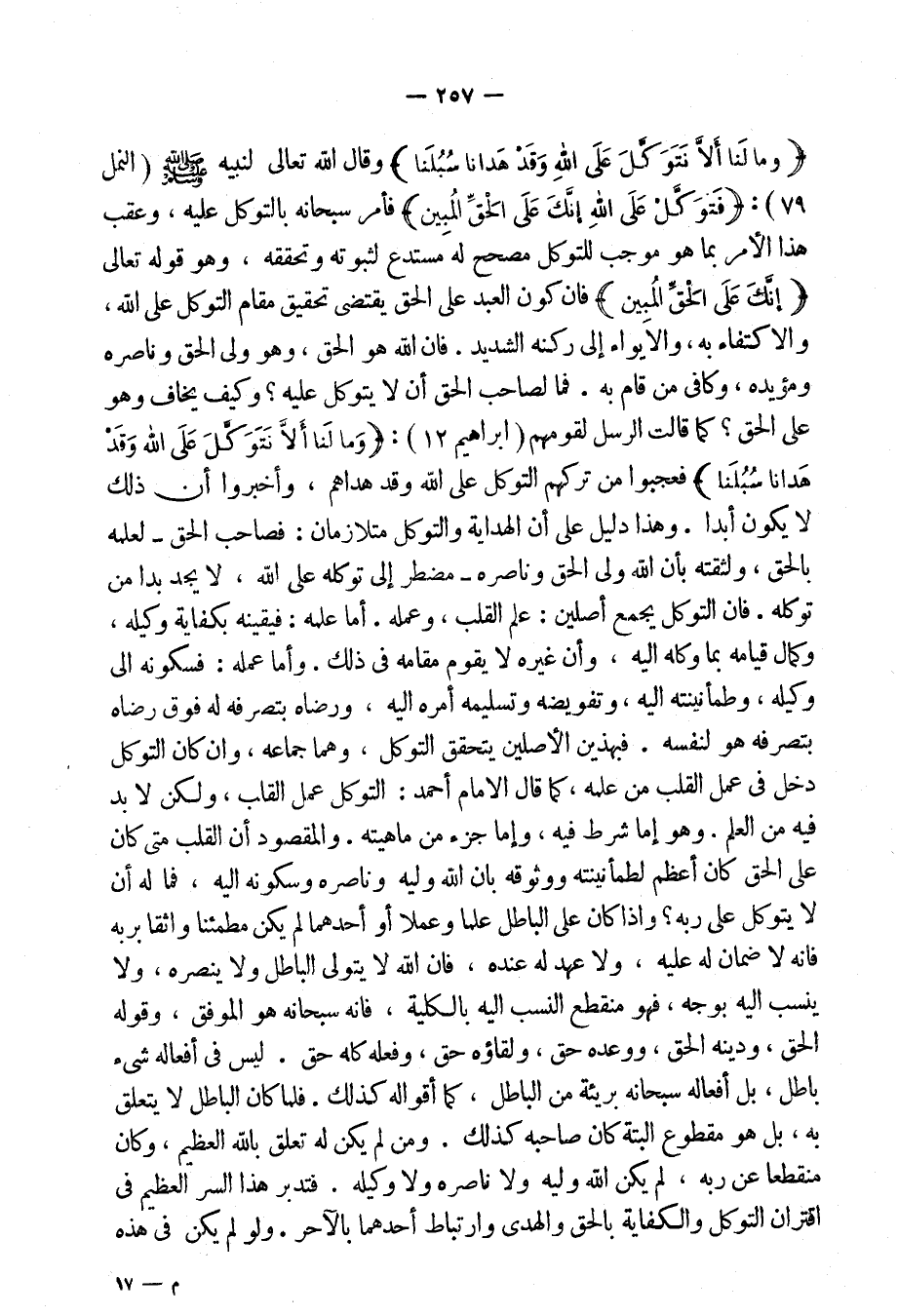 وهذا دليل على أن الهداية والتوكل متلازمان: فصادف الحق- لعلمه بالحق [وليقينه] بأن الله ولى الحق وناصره- مضطر إلى توكله على الله لا يجد بداً من توكله. فإن التوكل يجمع أصلين: علم القلب وعمله. أما علمه: فيقينه بكفاية وكيله، وكمال قيامه بما وكله إليه، وأن غيره لا يقوم مقامه فى ذلك. وأما عمله: فسكونه إلى وكيله، وطمأٌنينته إليه، وتفويضه وتسليمه أَمره إليه، وأن غيره لا يقوم مقامه فى ذلك. ورضاه بتصرفه له فوق رضاه بتصرفه هو لنفسه. فبهذين الأصلين يتحقق التوكل، وهما جُماعه، وإن كان التوكل دخل فى عمل القلب من عمله، كما قال الإمام أحمد: التوكل عمل القلب، ولكن لا بد فيه من العلم، وهو إما شرط فيه، وإما جزءٌ من ماهيته.