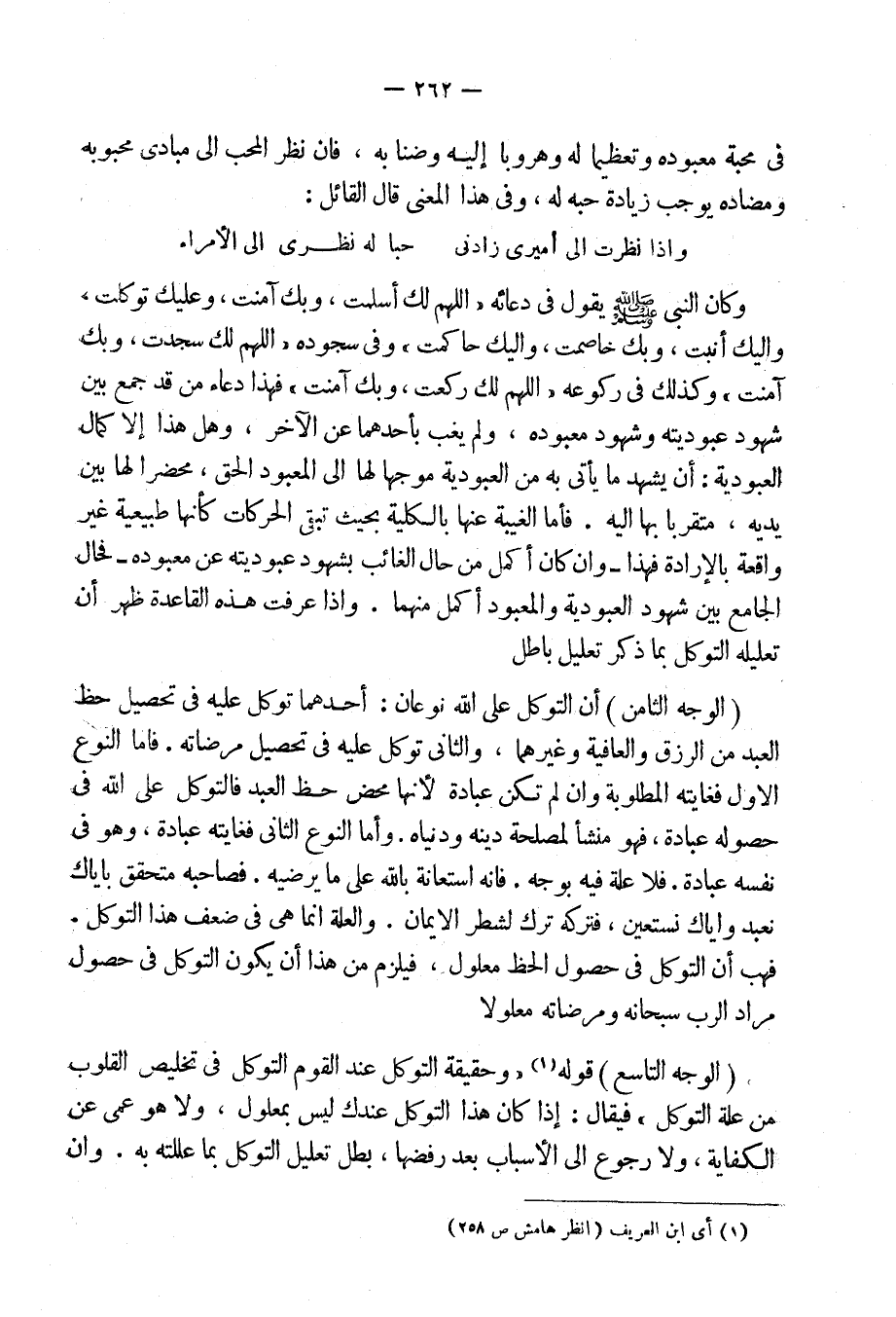 الوجه التاسع: قوله: "وحقيقة التوكل عند القوم التوكل فى تخليص القلوب من علة التوكل"، فيقال: إذا كان هذا التوكل عندك ليس بمعلول، ولا هو عمى عن الكفاية، ولا رجوع إلى الأسباب بعد رفضها، بطل تعليل التوكل بما عللته به. وإن