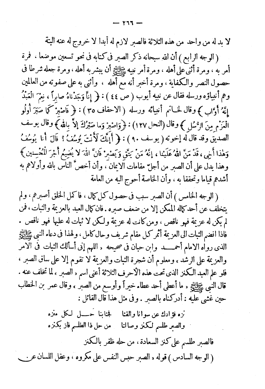 الوجه الرابع: أن الله سبحانه ذكر الصبر فى كتابه فى نحو تسعين موضعاً، فمرة أمر به، ومرة أثنى على أهله، ومرة أمر نبيه صلى الله عليه وسلم أن يبشر به أهله، ومرة جعله شرطاً فى حصول النصر والكفاية ومرة أخبر أنه مع أهله، وأثنى به على صفوته من العالمين وهم أنبياؤه ورسله، فقال عن نبيه أيوب: {إِنَا وَجَدْنَاهُ صَابِرَاً، نِعْمَ الْعَبْدُ إِنَّهُ أَوَّاب} [سورة ص: 44] ، وقال [تعالى] لخاتم أنبيائه ورسله: {فَاصْبِرْ كَمَا صَبَرَ أُولُوا الْعَزْمِ مِنِ الرُّسُلِ} [الأحقاف: 35] ، وقال: {وَاصْبِرْ وَمَا صَبْرُكَ إِلا بِاللهِ} [النمل: 127] ، وقال يوسف الصديق، وقد قال له إخوته: {أَإِنَّكَ لأنتَ يُوسُفُ قَالَ أَنَا يُوسُفُ وَهَذَا أَخِى، قَدْ مَنَّ اللهُ عَلَيْنَآ إِنَّهُ مَن يَتَّقِ وَيَصْبِرْ فَإِنَّ الله لا يُضِيَعُ أَجْرَ الْمُحْسِنِينَ} [يوسف:90] ، وهذا يدل على أن الصبر من أجل مقامات الإيمان، وأن أخصّ الناس بالله وأولاهم به أشدهم قياماً وتحققاً به، وأن الخاصة أحوج إليه من العامة.