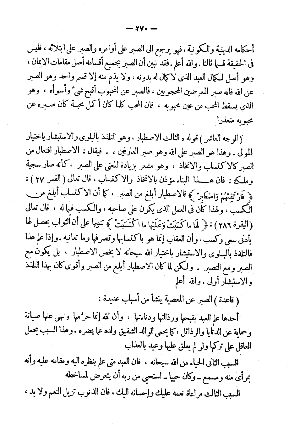 الوجه العاشر: قوله: "الثالث الاصطبار، وهو التلذذ بالبلوى والاستبشار باختيار المولى. وهذا هو الصبر على الله وهو صبر العارفين". فيقال: الاصطبار افتعال من الصبر كالاكتساب والاتخاذ، وهو مشعر بزيادة المعنى على الصبر، كأَنه صار سجية وملكة: فإن هذا البناء مؤذن بالاتخاذ والاكتساب، قال تعالى: {فَارْتَقِبْهُمْ وَاصْطَبِر} [القمر: 27] ، فالاصطبار أبلغ من الصبر كما أن الاكتساب أبلغ من الكسب، ولهذا كان فى العمل الذى يكون على صاحبه، والكسب فيما له، قال تعالى: {لَهَا مَا كَسَبَتْ وَعَلَيْهَا مَا اكْتَسَبَتْ} [البقرة: 286] تنبيهاً على أن الثواب يحصل لها بأَدنى سعى وكسب، وأن العقاب إنما هو باكتسابها وتصرفها وما تعانيه.