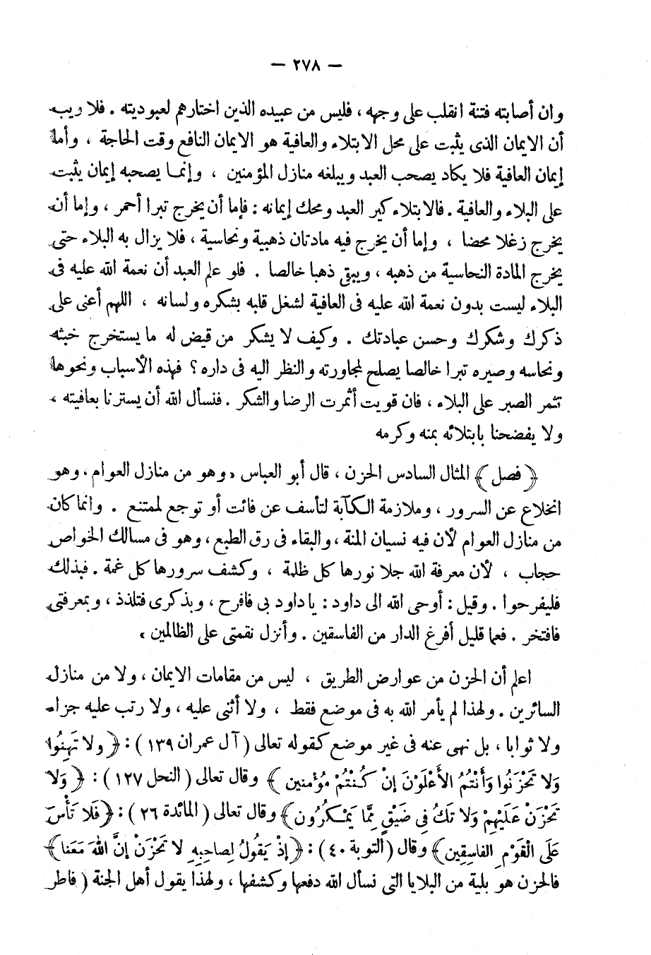 اعلم أن الحزن من عوارض الطريق، ليس من مقامات الإيمان ولا من منازل السائرين. ولهذا لم يأْمر الله به فى موضع قط ولا أَثنى عليه، ولا رتب عليه جزاء ولا ثواباً، بل نهى عنه فى غير موضع كقوله تعالى: {وَلا تَهِنُوا وَلا تَحْزَنُوا وَأَنتُمُ الأَعْلَوْنَ إِن كُنْتُم مُّؤْمِنِينَ} [آل عمران: 139] ، وقال تعالى: {وَلا تَحْزَنْ عَلَيْهِمْ وَلا تَكُ فِى ضِيقٍ مِمَّا يَمْكُرُونَ} [النحل: 127] ، وقال تعالى: {فَلا تأْسَ عَلَى الْقَوْمِ الْفَاسِقِينَ} [المائدة: 26] ، وقال: {إِذْ يَقُولُ لِصَاحِبِهِ لا تَحْزَنْ إِنَّ اللهَ مَعنَا} [التوبة: 40] ، فالحزن هو بلية من البلايا التى نسأَل الله دفعها وكشفها، ولهذا يقول أهل الجنة: