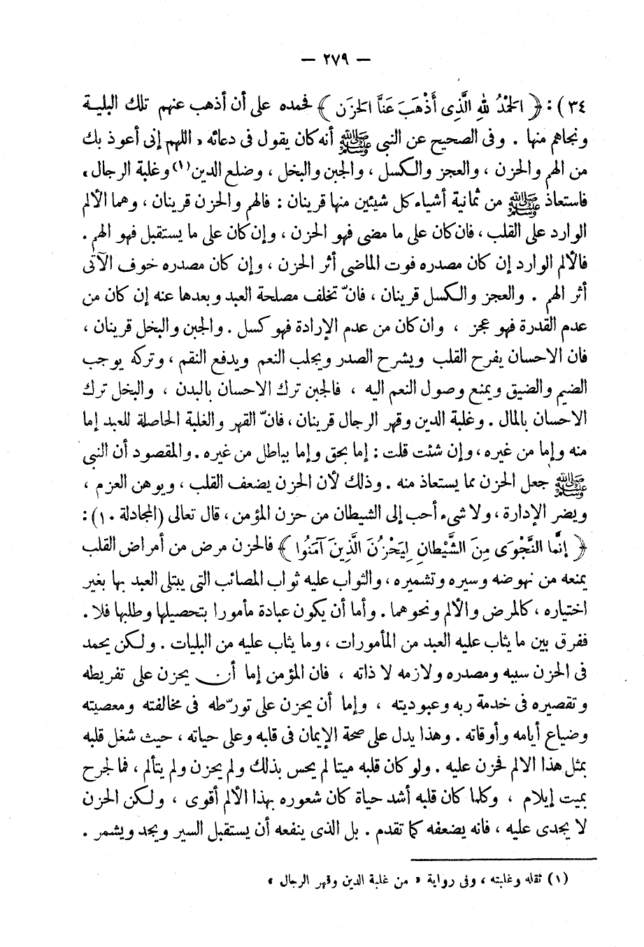 والمقصود أن النبى صلى الله عليه وسلم جعل الحزن مما يستعاذ منه. وذلك لأن الحزن يضعف القلب ويوهن العزم، ويضر الإرادة، ولا شيء أحب إلى الشيطان من حزن المؤمن، قال تعالى: {إِنَّمَا النَّجْوَى مِنَ الشَّيْطانِ لِيَحْزُنَ الَّذِينَ آمَنُوا} [المجادلة: 10] ، فالحزن مرض من أمراض القلب يمنعه من نهوضه وسيره وتشميره، والثواب عليه ثواب المصائب التى يبتلى العبد بها بغير اختياره، كالمرض والألم ونحوهما، وأما أن يكون عبادة مأْموراً بتحصيلها وطلبها فلا، ففرق بين ما يثاب عليه العبد من المأمورات، وما يثاب عليه من البليات. ولكن يحمد فى الحزن سببه ومصدره ولازمه لا ذاته، فإن المؤمن إما أن يحزن.. على تفريطه وتقصيره خدمة ربه وعبوديته، وأما أن يحزن على تورّطه فى مخالفته ومعصيه وضياع أيامه وأوقاته.