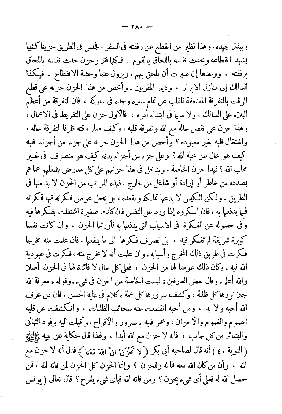 بل الذى ينفعه أن يستقبل السير ويجد ويشمر، ويبذل جهده، وهذا نظير من انقطع عن رفقته فى السفر، فجلس فى الطريق حزيناً كئيباً يشهد انقطاعه ويحدث نفسه باللحاق بالقوم. فكلما فتر وحزن حدث نفسه باللحاق برفقته، ووعدها إن صبرت أن تلحق بهم، ويزول عنها وحشة الانقطاع. فهكذا السالك إلى منازل الأبرار، وديار المقربين وأخص من هذا الحزن حزنه على قطع الوقت بالتفرقة المضعفة للقلب عن تمام سيره وجده فى سلوكه، فإن التفرقة من أعظم البلاء على السالك، ولا سيما فى ابتداء أمره، فالأول حزن على التفريط فى [الأعمال] ، وهذا حزن على نقص حاله مع الله وتفرقة قلبه وكيف صار ظرفاً لتفرقة حاله، واشتغال قلبه بغير معبوده.