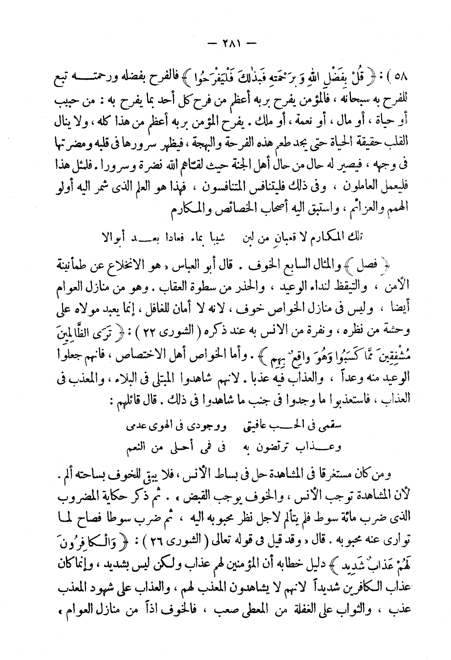 أيضاً، وليس فى منازل الخواص خوف، لأنه لا أمان للغافل، إنما يعبد مولاه على وحشة من نظره، ونفرة من الأُنس به عند ذكره: {تَرَى الظَّالِمِينَ مُشْفِقِينَ مِمَّا كَسَبُوا وَهُوَ وَاقِعٌ بِهِمْ} [الشورى: 22] .