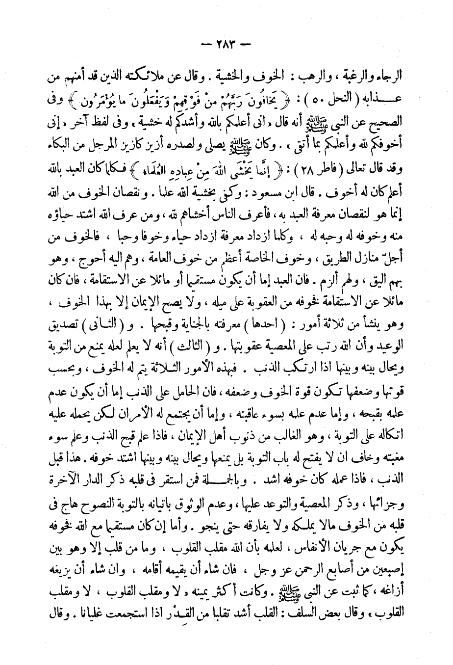 والثالث: أنه لا يعلم لعله يمنع من التوبة ويحال بينه وبينها إذا ارتكب الذنب. فبهذه الأمور الثلاثة يتم له الخوف، وبحسب قوتها وضعفها تكون قوة الخوف وضعفه، فإن الحامل على الذنب إما أن يكون عدم علمه بقبحه، وإما عدم علمه بسوءِ عاقبته، وإما أن يجتمع له الأمران لكن يحمله عليه اتكاله على التوبة، وهو الغالب من ذنوب أهل الإيمان، فإذا علم قبح الذنب وعلم سوءَ مغبته وخاف أن لا يفتح له باب التوبة بل يمنعها ويحال بينه وبينها اشتد خوفه. هذا قبل الذنب، فإذا عمله كان خوفه أشد.
