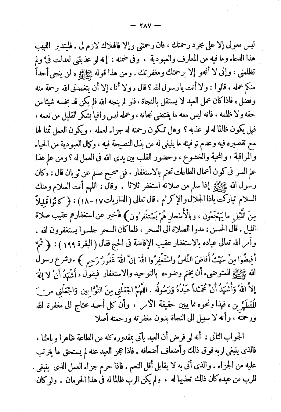 وأمر الله تعالى عباده بالاستغفار عقيب الإفاضة فى الحج فقال: {ثُمَّ أَفِيضُوا مِنْ حَيْثُ أَفَاضَ النَّاسُ وَاسْتَغْفِرُوا اللهَ إِنَّ اللهَ غَفُورٌ رَحِيمٌ} [البقرة: 199] ، وشرع رسول الله صلى الله عليه وسلم للمتوضيء أن يختم وضوءَه بالتوحيد والاستغفار فيقول: "أَشْهَدُ أَنَّ لا إِلَهَ إِلا اللهُ وأَشْهَدُ أَنَّ مُحَمَّداً عَبْدُهُ وَرَسُولُه، اللَّهمَّ اجْعَلْنِى مِنَ التَّوَّابِين وَاجْعَلْنِى مِنَ الْمُتَطَهِّرِين"، فهذا ونحوه مما يبين حقيقة الأمر، وأن كل أحد محتاج إلى مغفرة الله ورحمته، وأنه لا سبيل إلى النجاة بدون مغفرته ورحمته أصلاً.