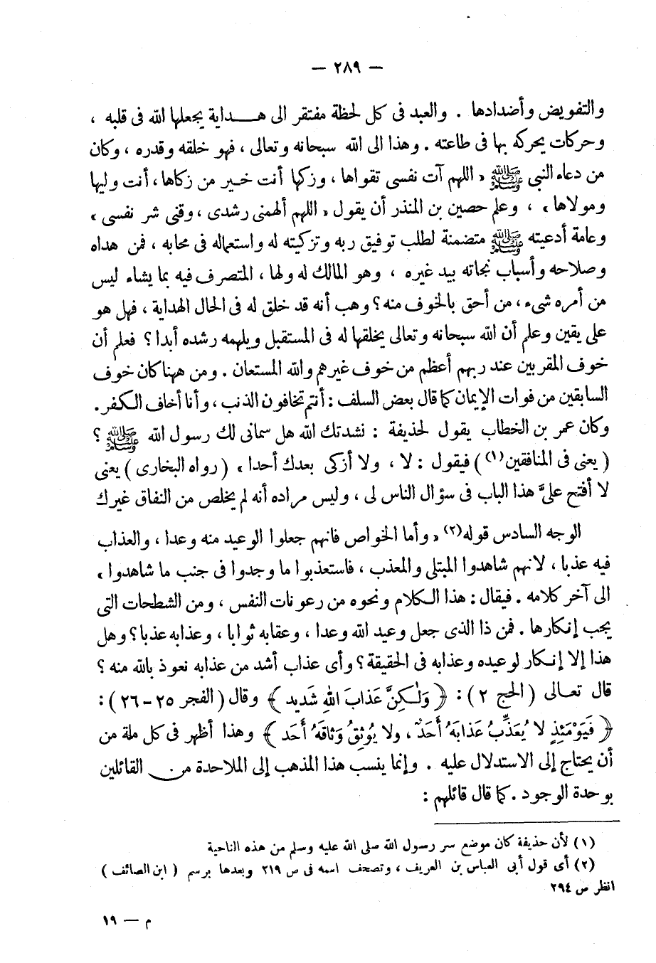 وكان عمر بن الخطاب يقول لحذيفة: نشدتك الله هل سمانى لك رسول الله صلى الله عليه وسلم؟ يعنى فى المنافقين فيقول: لا، ولا أزكى بعدك أحداً" رواه البخارى يعنى لا أفتح على هذا الباب فى سؤال الناس لى، وليس مراده أنه لم يخلص من النفاق غيرك.