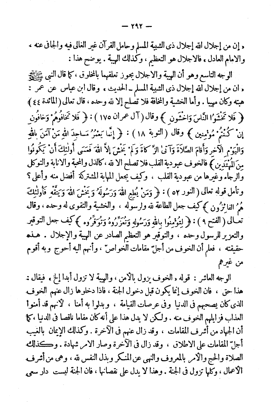 فالخوف عبودية القلب فلا تصلح إلا لله [وحده] كالذل والمحبة والإنابة والتوكل والرجاء وغيرها من عبودية القلب، [فكيف] يجعل المهابة المشتركة أفضل منه وأعلى؟ وتأمل قوله تعالى: {وَمَن يُطِعِ اللهَ وَرَسُولَهُ وَيَخْشَ اللهَ وَيَتَّقهِ فَأُولَئِكَ هُمُ الْفَآئِزُونَ} [النور: 52] ، كيف جعل الطاعة لله ولرسوله، والخشية والتقوى له وحده، وقال تعالى: {لِتُؤْمِنُوا بِاللهِ وَرَسُولِهِ وَتُعَزِّرُوهُ وَتُوَقِّرُوهُ} [الفتح: 9] ، كيف جعل التوقير والتعزيز للرسول وحده، والتوقير هو التعظيم الصادر عن الهيبة والإجلال.
