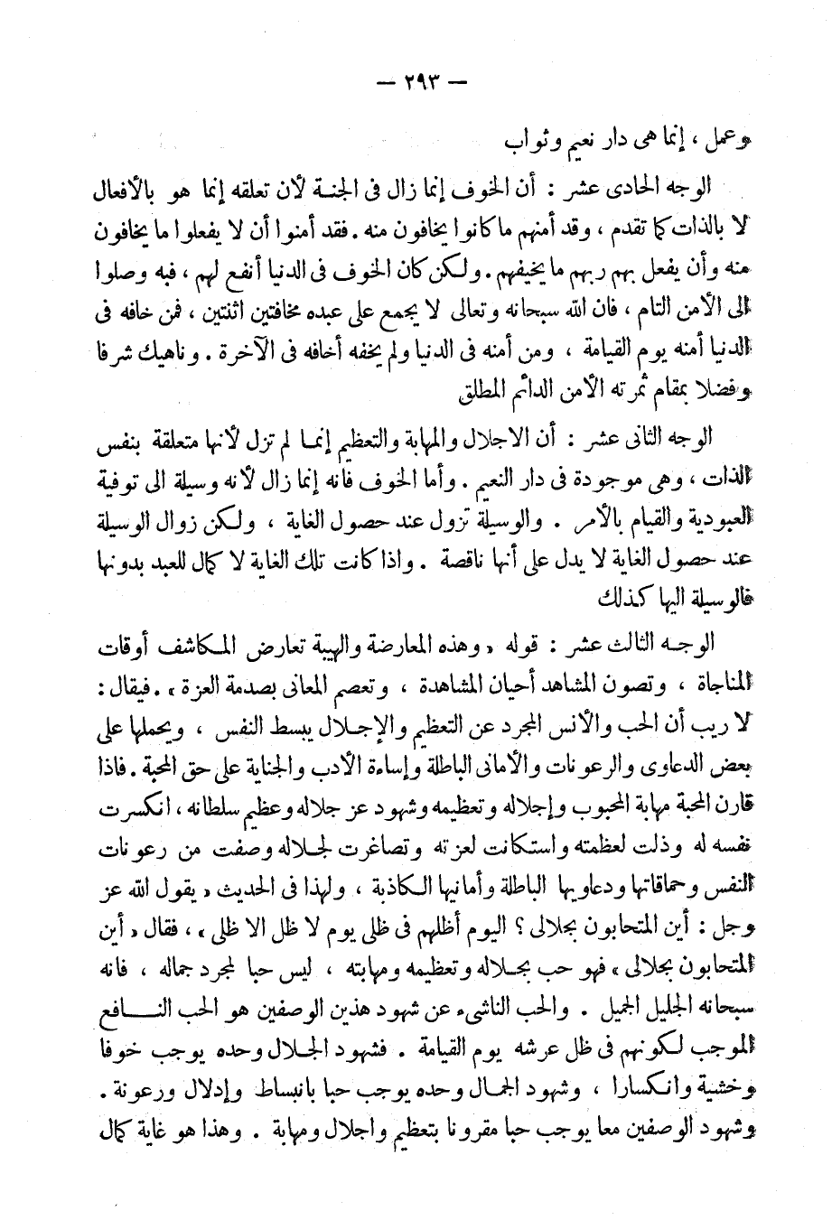 الوجه [الحادى عشر] : أن الإجلال والمهابة والتعظيم إنما لم تزل لأنها متعلقة بنفس الذات، وهى موجودة فى دار النعيم. وأما الخوف فإنه إنما زال لأنه وسيلة إلى توفية العبودية والقيام بالأمر.