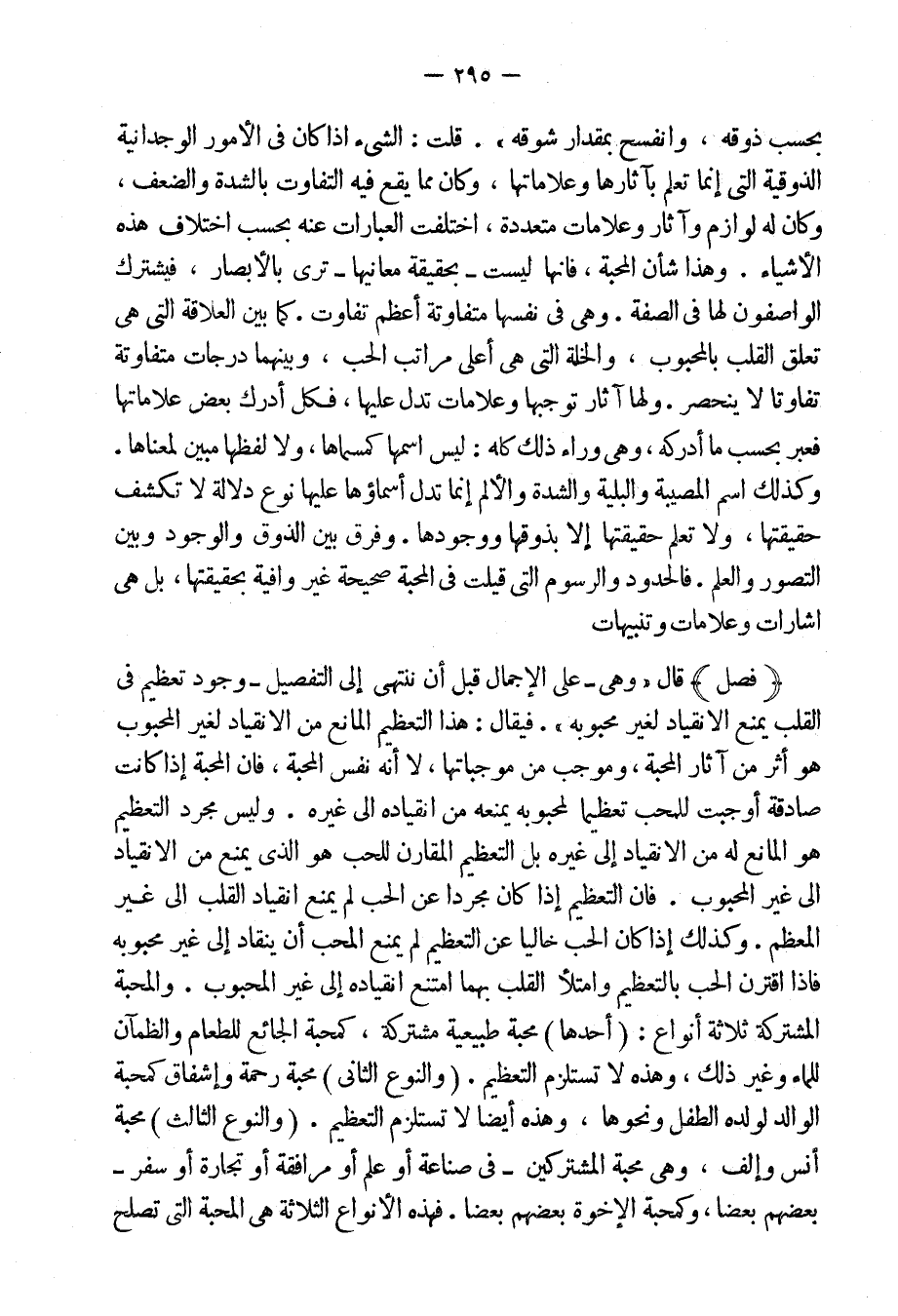 وهذا شأن المحبة، فإنها ليست- بحقيقة معانيها- ترى بالأبصار، فيشترك الواصفون لها فى الصفة. وهى فى نفسها متفاوتة أعظم تفاوت. كما بين العلاقة التى هى تعلق القلب بالمحبوب، والخلة التى هى أعلى مراتب الحب، وبينهما درجات متفاوتة تفاوتاً لا ينحصر.