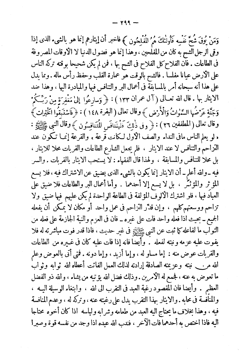 ومما يدل على هذا أنه سبحانه أمر بالمسابقة فى أعمال البر والتنافس فيها والمبادرة إليها، وهذا ضد الإيثار بها. قال الله تعالى: {وَسَارِعُوا إِلَى مَغْفِرَةٍ مِن رَبِّكُمْ وَجَنَّةٍ عَرْضُهَا السَّمَوَاتُ وَالأَرْضُ} [آل عمران: 133] ، وقال تعالى: {فَاسْتَبقُوا الْخَيْرَاتِ} [البقرة: 148] [المائدة: 48] ، وقال تعالى: {وَفِى ذَلِكَ فَلْيَتَنَافَسِ الْمُتَنَافِسُونَ} [المطففين: 26] ، وقال النبى صلى الله عليه وسلم: "لو يعلم الناس ما فى النداءِ والصف الأول لكانت قرعة". والقرعة إنما تكون عند التزاحم والتنافس لا عند الإيثار فلم يجعل الشارع الطاعات والقربات محلاً للإيثار، بل محلاً للتنافس والمسابقة، ولهذا قال الفقهاءُ: لا يستحب الإيثار بالقربات والسر فيه- والله أعلم- أن الإيثار إنما يكون بالشيء الذى يضيق عن الاشتراك فيه، فلا يسع المؤثر والمؤثر، بل لا يسع إلا أحدهما، وأما أعمال البر والطاعات فلا ضيق على العباد فيها، فلو اشترك الألوف المؤلفة فى الطاعة الواحدة لم يكن عليهم فيها ضيق ولا تزاحم ووسعتهم كلهم، وإن قدِّر التزاحم فى عمل واحد أو مكان لا يمكن أن يفعله الجميع- بحيث إذا فعله واحد فات على غيره، فإن فى العزم والنية الجازمة على فعله من الثواب ما لفاعله كما ثبت عن النبى صلى الله عليه وسلم فى غير حديث، فإذا قدر فوت مباشرته له فلا يفوت عليه عزمه ونيته لفعله.