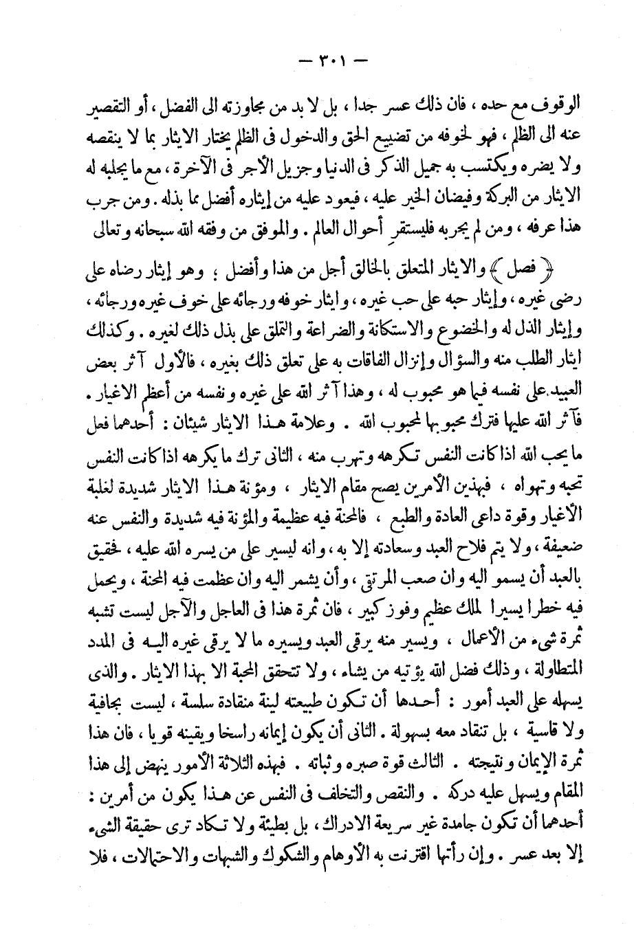 والإيثار المتعلق بالخالق أجل من هذا وأفضل، وهو إيثار [رضاه على] رضى غيره، وإيثار حبه على حب غيره، وإيثار خوفه ورجائه على خوف غيره ورجائه، وإيثار الذل له [و] الخضوع والاستكانة والضراعة والتملق على بذل ذلك لغيره. وكذلك إيثار الطلب منه والسؤال وإنزال الفاقات به على تعلق ذلك بغيره، فالأول آثر بعض العبيد على نفسه فيما هو محبوب له، وهذا آثر الله على غيره ونفسه من أعظم الأغيار. فآثر الله عليها فترك محبوبها لمحبوب الله.
