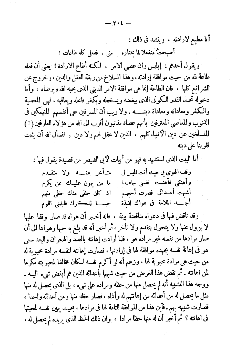ويقول أحدهم: إبليس وإن عصى الأمر، لكنه أطاع الإرادة، يعنى أن فعله طاعة لله من حيث موافقة إرادته، وهذا انسلاخ من ربقة العقل والدين، وخروج عن الشرائع كلها، فإن طاعة الله إنما هى موافقة الأمر الدينى الذى يحبه الله ويرضاه، وأما دخوله تحت القدر الكونى الذى يبغضه ويسخطه ويكفر فاعله ويعاقبه، فهى المعصية والكفر ومعاداته ومعاداة دينه. ولا ريب أن المسرفين على أنفسهم المنهمكين فى الذنوب والمعاصى المعترفين بأنهم عصاة مذنبون أقرب إلى الله من هؤلاءِ العارفين المنسلخين عن دين الأنبياءِ كلهم، والذين لا عقل لهم ولا دين فنسأل الله أن يثبت قلوبنا على دينه:
