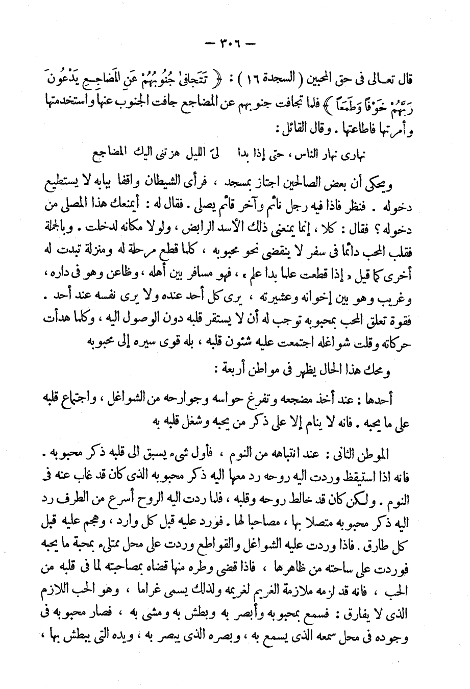 قال الله تعالى فى حق المحبين: {تَتَجَافَى جُنُوبُهُمْ عَنِ الْمَضَاجِعِ يَدْعُونَ رَبَّهُمْ خَوْفاً وَطَعَماً} [السجدة: 16] ، فلما تجافت جنوبهم عن المضاجع جافت الجنوب عنها واستخدمتها وأمرتها فأطاعتها. وقال القائل: