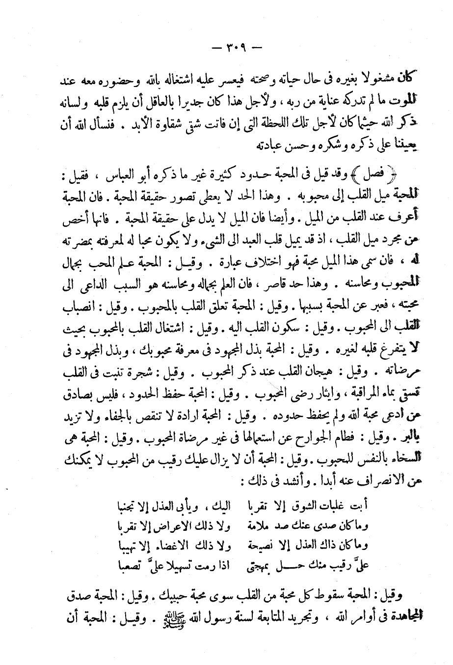 فإنها أخص من مجرد ميل القلب، إذ قد يميل قلب العبد إلى الشيء ولا يكون محباً له لمعرفته بمضرته له، فإن سمى هذا الميل محبة فهو اختلاف عبارة. وقيل: المحبة علم المحب بجمال المحبوب ومحاسنه. وهذا حد قاصر، فإن العلم بجماله ومحاسنه هو السبب الداعى إلى محبته، فعبر عن المحبة بسببها. وقيل: المحبة تعلق القلب بالمحبوب. وقيل: انصباب القلب إلى المحبوب. وقيل: سكون القلب إليه. وقيل: اشتغال القلب بالمحبوب، بحيث لا يتفرغ قلبه لغيره. وقيل: المحبة بذل المجهود فى معرفة محبوبك، وبذل المجهود فى مرضاته. وقيل: هيجان القلب عند ذكر المحبوب، وقيل: شجرة تنبت فى القلب تسقى بماء [الموافقة] ، وإيثار رضى المحبوب. وقيل: المحبة حفظ الحدود، فليس بصادق من ادعى محبة الله ولم يحفظ حدوده. وقيل: المحبة إرادة لا تنقص بالجفاءِ ولا تزيد بالبر [وقيل: فطام والجوارح عن إستعمالها فى غير مرضاة المحبوب] وقيل: المحبة هى السخاءُ بالنفس للمحبوب وقيل: المحبة أن لا يزال عليك رقيب من المحبوب لا يمكنك من الانصراف عنه أبداً. وأنشد فى ذلك: