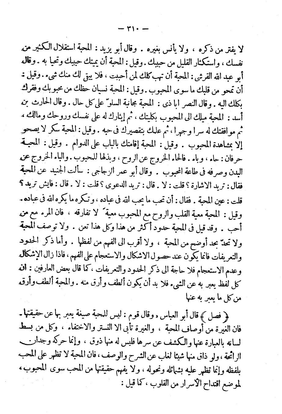 وقال أبو عمر الزجاجى: سألت الجنيد عن المحبة فقال: تريد الإشارة؟ قلت: لا. قال: تريد الدعوى؟ قلت: لا. قال: فإيش تريد؟ قلت: عين المحبة، فقال: أن تحب ما يحب الله فى عباده، وتكره ما يكرهه الله فى عباده. وقيل: المحبة معية القلب والروح مع المحبوب معيةً لا تفارقه، فإن المرءَ مع من أحب، وقد قيل فى المحبة حدود أكثر من هذا وكل هذا تعن، ولا توصف المحبة ولا تحد بحد أوضح من المحبة، ولا أقرب إلى الفهم من لفظها.