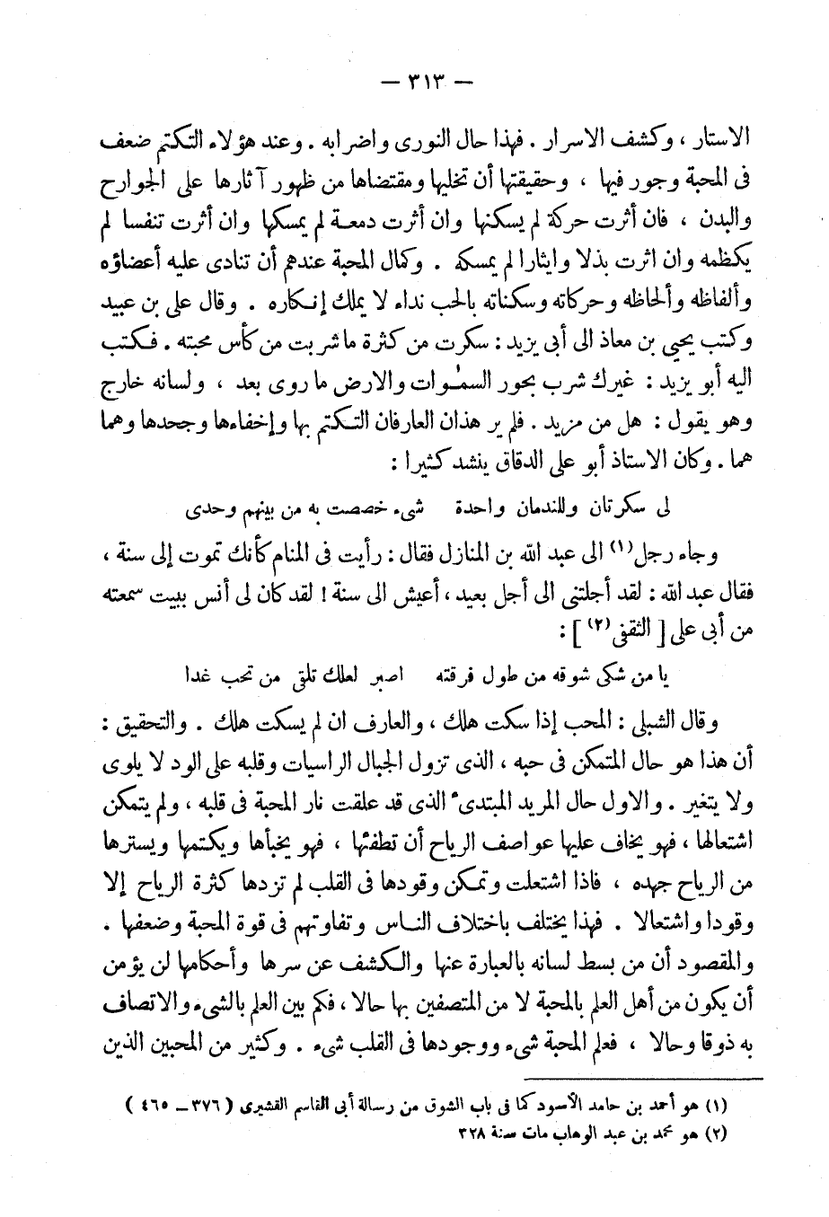 وقال على بن عبيد وكتب يحيى بن معاذ إلى أبى يزيد: سكرت من كثرة ما شربت من كأْس محبته، فكتب إليه أبو يزيد: غيرك شرب بحور السموات والأرض ما روى بعد، ولسانه خارج وهو يقول هل من مزيد. فلم ير هذان العارفان التكتم بها وإخفاءَها وجحدها وهما هما. وكان الأُستاذ أبو على الدقاق ينشد كثيراً: