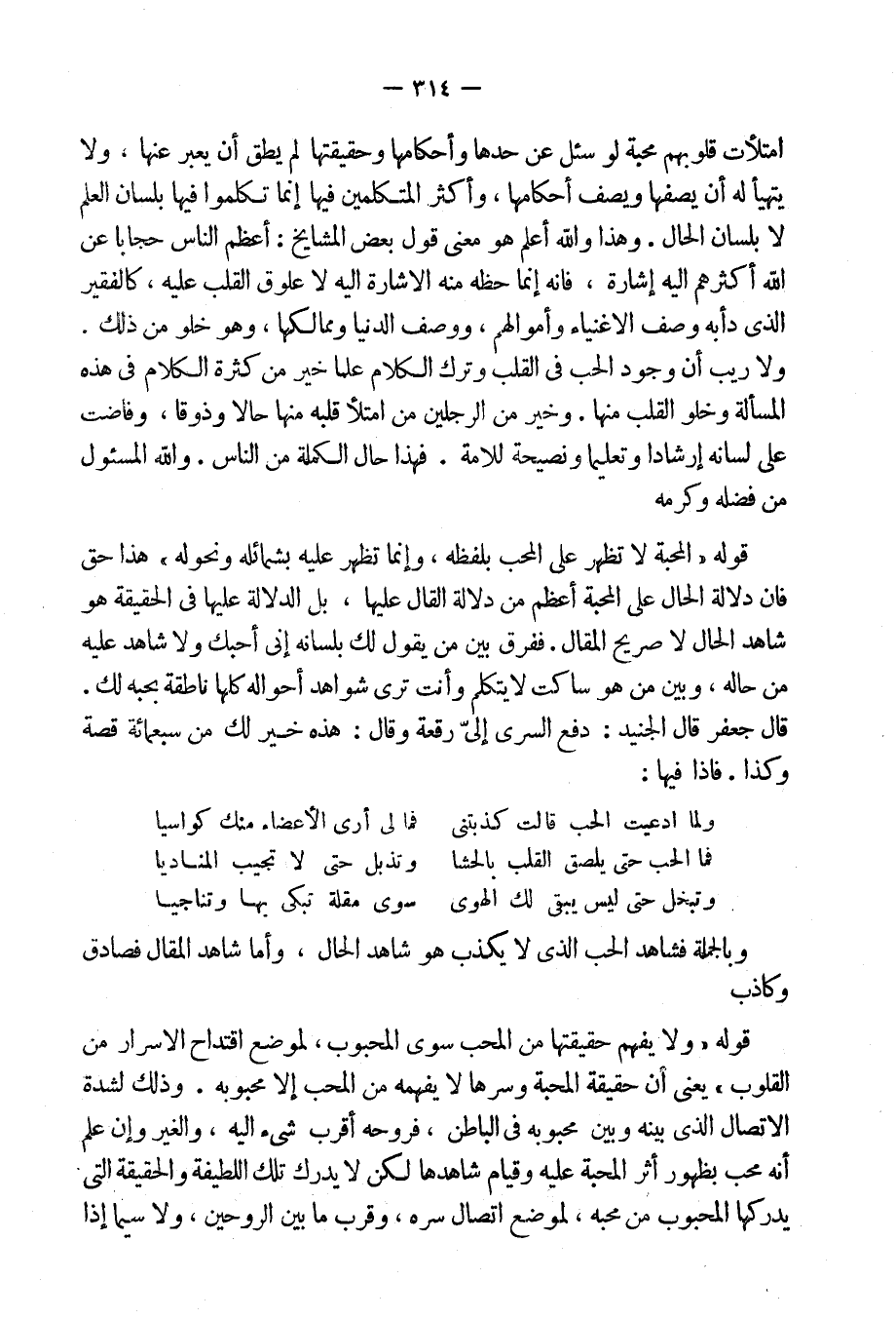 امتلأت قلوبهم محبة لو سئل عن حدها وأحكامها وحقيقتها لم يطق أن يعبر عنها، ولا يتهيأ له أن يصفها ويصف أحكامها، وأكثر المتكلمين فيها إنما تكلموا فيها بلسان العلم لا بلسان الحال.