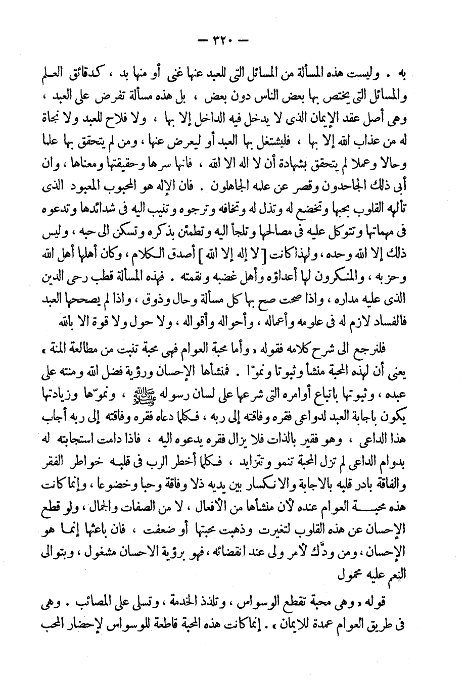 إلا به. وليست هذه المسألة من المسائل التى للعبد عنها غنى أو منها بد، كدقائق العلم والمسائل التى يختص بها بعض الناس دون بعض، بل هذه مسألة تفرض على العبد، وهى أصل عقد الإيمان الذى لا يدخل فيه الداخل إلا بها ولا فلاح للعبد ولا نجاة له من عذاب الله إلا بها، فليشتغل بها العبد أو ليعرض عنها، ومن لم يتحقق بها علماً وحالاً وعملاً لم يتحقق بشهادة أن لا إِله إلا الله، فإنها سرها وحقيقتها ومعناها، وإن أبى ذلك الجاحدون وقصر عن علمه الجاهلون.