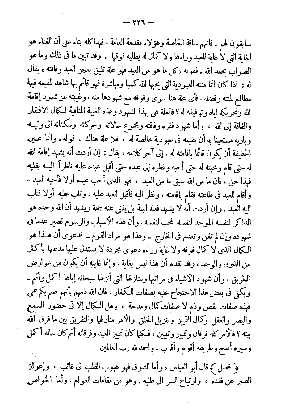 سابقون لهم، فإنهم ساقة الخاصة وهؤلاءِ مقدمة العامة، فهذا كله بناء على أن الفناءَ هو الغاية التى لا غاية للعبد وراءَها ولا كمال له يطلبه فوقها. وقد تبين ما فى ذلك، وما هو الصواب بحمد الله، فقوله [رحمه الله] : "كل ما هو من العبد فهو علة تليق بعجز العبد وفاقته" يقال له: إذا كان إنما [منه] العبودية التى يحبها الله كسباً ومباشرة فهو قائم بها شاهد لمقيمه فيها مطالع [لمنه] ، وفضله، فأى علة هنا سوى وقوفه مع شهودها منه، وغيبته عن شهود إقامة الله وتحريكه إياه، وتوفيقه له؟ فالعلة هى بهذا الشهود وهذه الغيبة المنفاية لكمال الافتقار والفاقة إلى الله، وأما شهود فقره وفاقته ومجموع حالاته وحركاته وسكناته إلى وليه [وبارئه] مستعيناً به أن يقيمه فى عبودية خالصة له، فلا علة هناك.