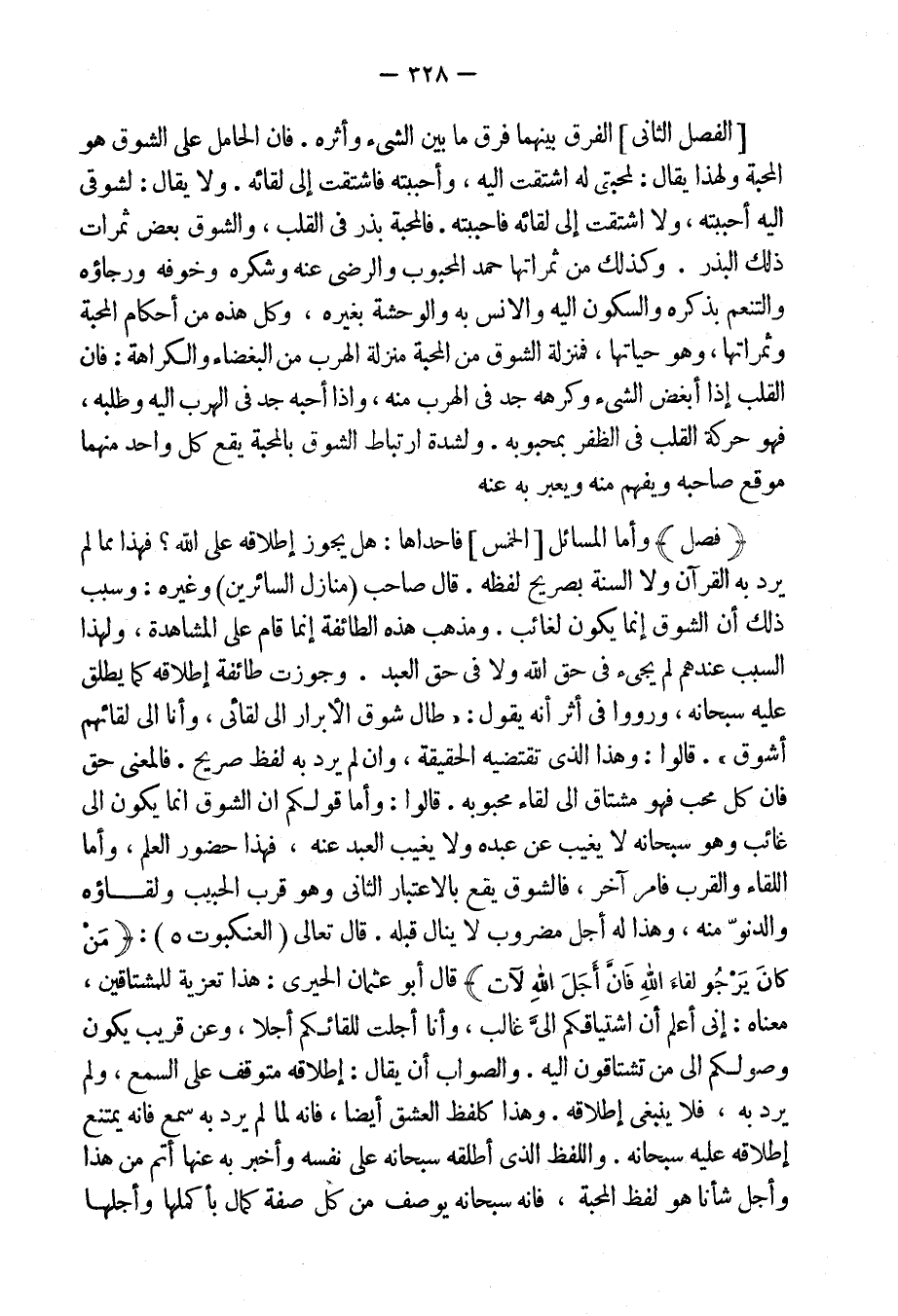 وأما المسائل [الخمس] فإحداها: هل يجوز إطلاقه على الله؟ فهذا مما لم يرد به القرآن ولا السُّنَّة بصريح لفظه. قال صاحب "منازل السائرين" وغيره: وسبب ذلك أن الشوق إنما يكون لغائب.