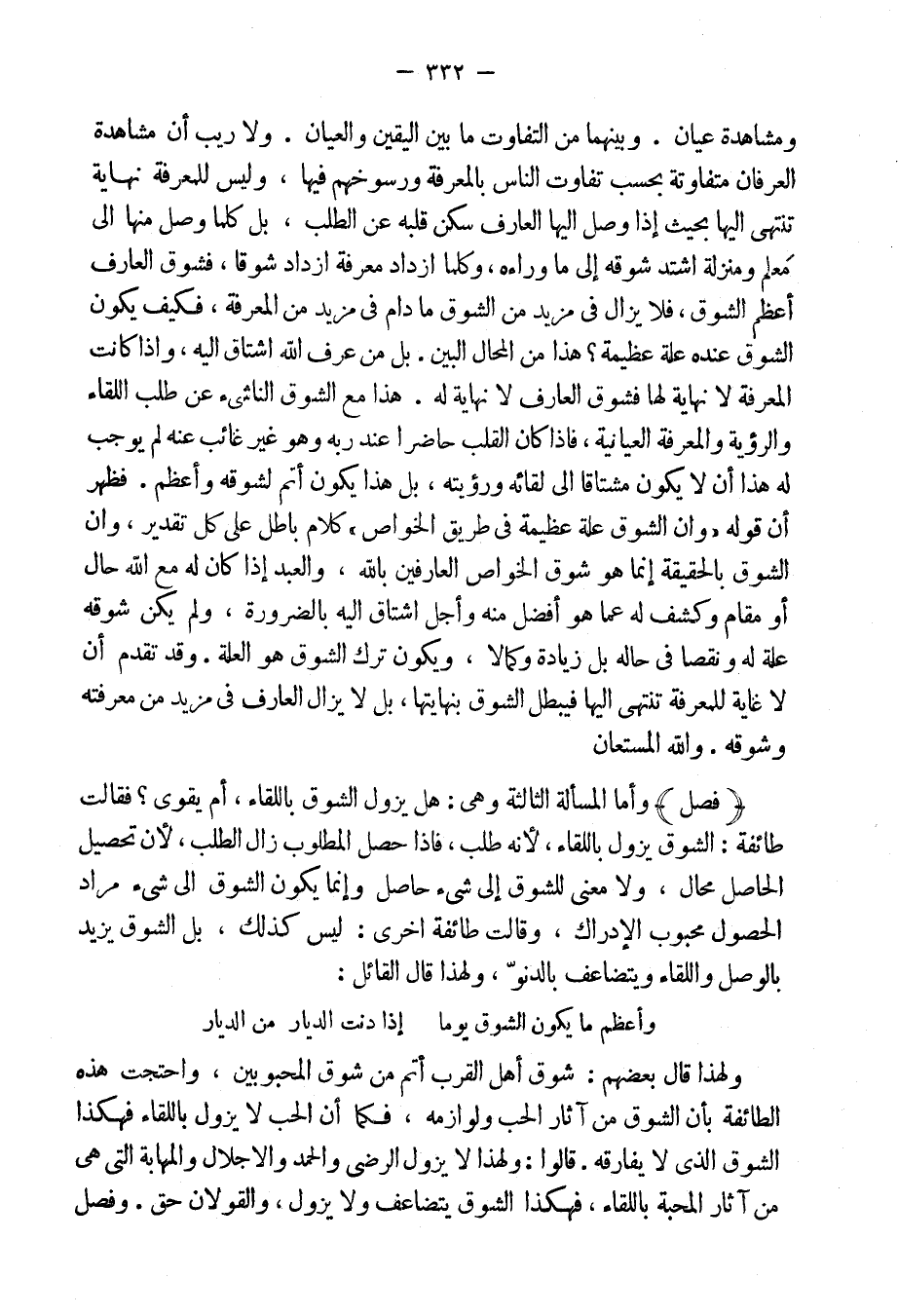 وأما المسألة [الثالثة] وهى: هل يزول الشوق باللقاء أم يقوى؟ فقالت طائفة: الشوق يزول باللقاء، لأنه طلب، فإذا حصل المطلوب زال الطلب، لأن تحصيل الحاصل محال، ولا معنى للشوق إلى شيء حاصل، وإنما يكون الشوق إلى شيء مراد الحصول محبوب الإدراك، وقالت طائفة أُخرى: ليس كذلك بل الشوق يزيد بالوصول واللقاء ويتضاعف بالدنوّ، ولهذا قال القائل: