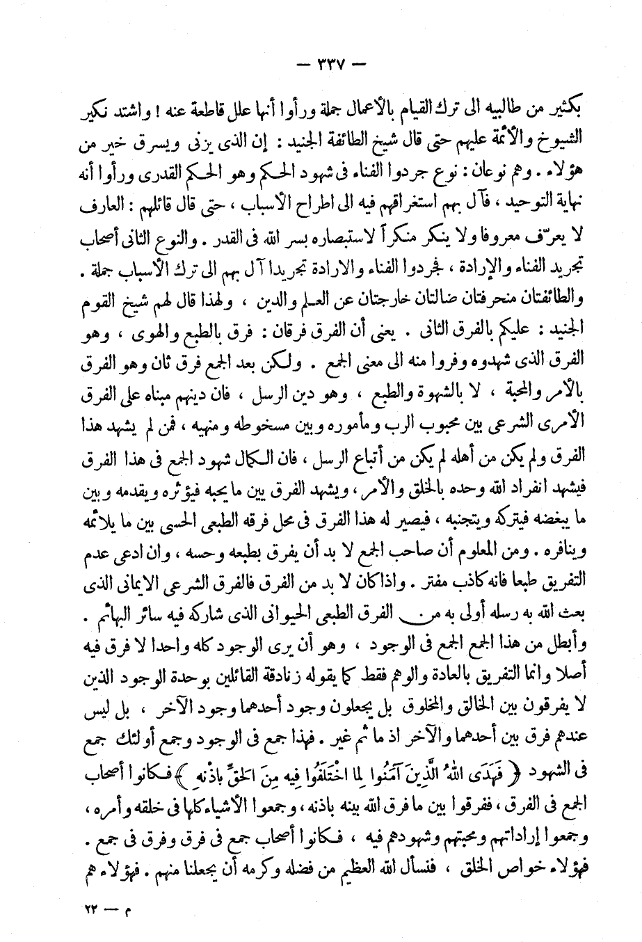 والنوع الثانى: أصحاب تجريد الفناءِ والإرادة فجردوا الفناءَ والإرادة تجريداً آل بهم إلى ترك الأسباب جملة، والطائفتان منحرفتان ضالتان خارجتان عن العلم والدين، ولهذا قال لهم شيخ القوم الجنيد: عليكم بالفرق الثانى. يعنى أن الفرق فرقان: فرق بالطبع والهوى، وهو الفرق الذى شهدوه وفروا منه إلى معنى الجمع.