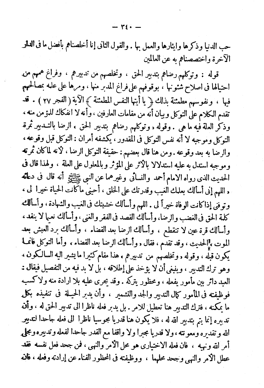 ومن هنا قال بعضهم: حقيقة التوكل الرضا لأنه لما كان ثمرته وموجبه استدل له عليه استدلالاً بالأثر على المؤثر وبالمعلول على العلة، ولهذا قال فى الحديث الذى رواه الإمام أحمد والنسائى: وغيرهما عن النبى صلى الله عليه وسلم أنه قال فى دعائه: "اللهم إنى أسألك بعلمك الغيب وقدرتك على الخلق أحيني ما كانت الحياة خيراً لى، وتوفنى إذا كانت الوفاة خيراً لي، اللهم وأسألك خشيتك فى الغيب والشهادة، وأسألك كلمة الحق فى الغضب والرضا، وأسألك القصد فى الفقر والغنى، وأسألك نعيماً لا ينفد، وأسألك قرة عين لا تنقطع، وأسألك الرضا بعد القضاءِ، وأسألك برد العيش بعد الموت" الحديث. وقد تقدم، فقال: "وأسألك الرضا بعد القضاء".