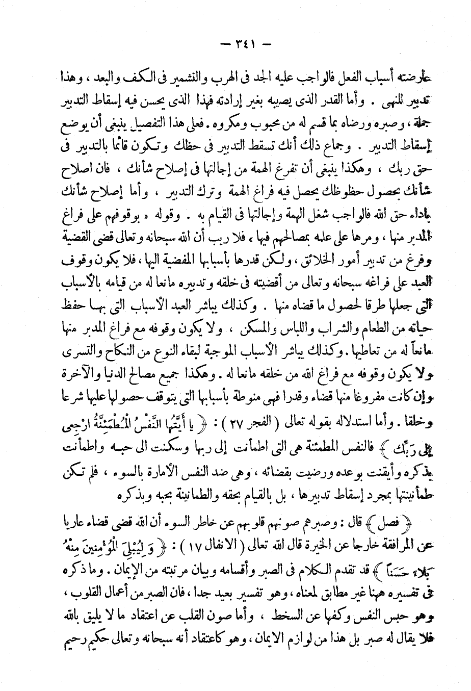 وأما استدلاله بقوله تعالى: {يأَيتُهَا النَّفْسُ الْمُطْمَئِنَّةُ ارْجِعِى إِلَى رَبِّكَ} [الفجر: 27-28] ، فالنفس المطمئنة هى التى اطمأنت إلى ربها وسكنت إلى حبه واطمأنت بذكره وأيقنت بوعده ورضيت بقضائه، وهى ضد النفس الأمارة بالسوءِ، فلم تكن طمأنينتها بمجرد إسقاط تدبيرها، بل القيام بحقه والطمأّنينة بحبه وبذكره.