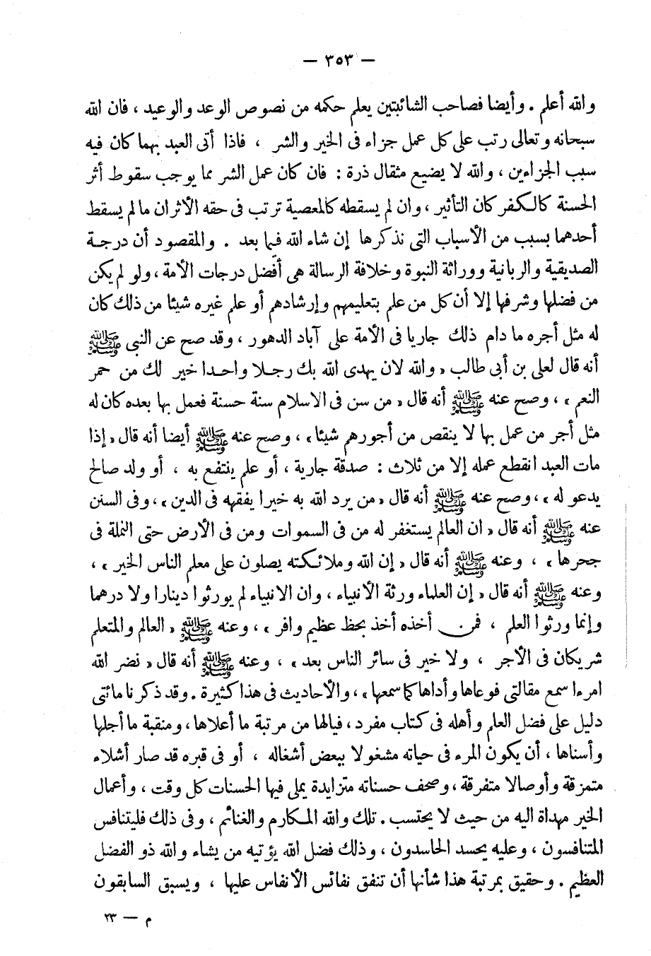 والأحاديث فى هذا كثيرة، وقد ذكرنا مائتى دليل على فضل العلم وأهله فى كتاب مفرد، فيالها من مرتبة ما أعلاها، ومنقبة ما أجلها وأسناها، أن يكون المرءُ فى حياته مشغولاً ببعض أشغاله، أو فى قبره قد صار أشلاء متمزقاً وأوصالاً متفرقة، وصحف حسناته متزايدة يملى فيها الحسنات كل وقت، وأعمال الخير مهداة إليه من حيث لا يحتسب تلك والله المكارم والغنائم، وفى ذلك فليتنافس المتنافسون، وعليه يحسد الحاسدون، وذلك فضل الله يؤتيه من يشاء والله ذو الفضل العظيم.