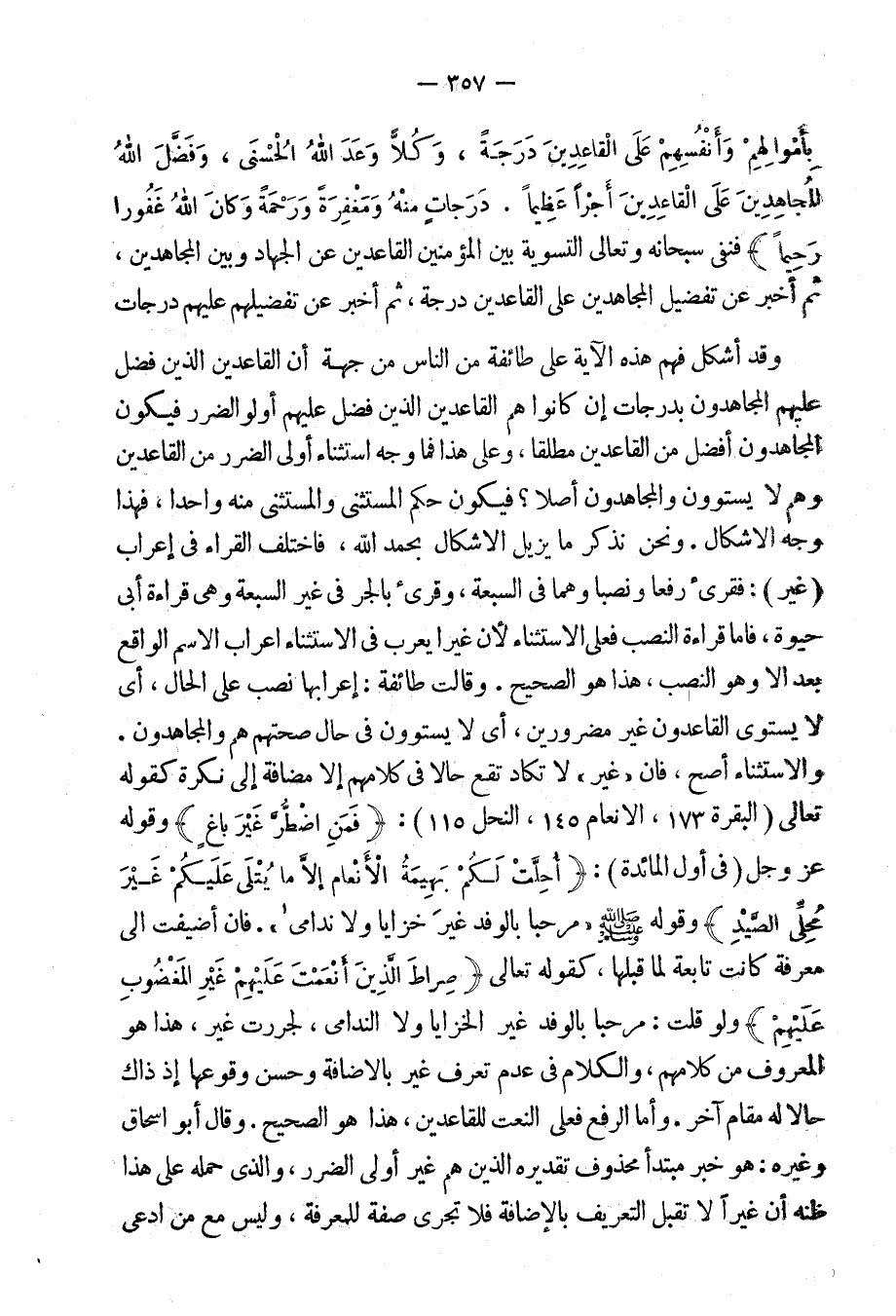 وقالت طائفة: إعرابها نصب على الحال، أى لا يستوى القاعدون غير مضرورين، أى لا يستوون فى حال صحتهم هم والمجاهدون، والاستثناء أصح، فإن "غير" لا تكاد تقع حالاً فى كلامهم إلا مضافة إلى نكرة كقوله تعالى: {فَمَنِ اضْطُرَّ غَيْرَ بَاغٍ} [البقرة: 173] [الأنعام: 145] [النحل: 115] ، وقوله عَزَّ وجَلَّ فى أول المائدة: {أُحِلَّتْ لَكُمْ بَهِيمَةُ الأَنْعَامِ إِلا مَا يُتلَى عَلَيْكُمْ غَيْرَ مُحِلِّى الصَّيْدِ} [المائدة: 1]