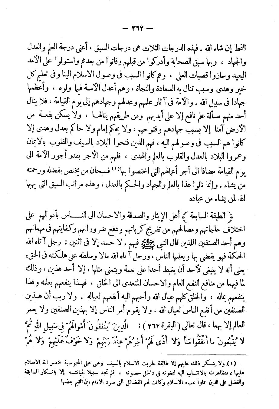 فهذه الدرجات الثلاث هى درجات السبق، أعنى درجة العلم والعدل والجهاد وبها سبق الصحابة [رضى الله عنه] وأدركوا من قبلهم وفاتوا من بعدهم واستولوا على الأمد البعيد وحازوا قصبات العلى، وهم كانوا السبب فى [بلوغ] الإسلام إلينا وفى تعليم كل خير وهدى وسبب تنال به السعادة والنجاة، وهم أعدل الأُمة فيما ولوه، وأعظمها جهاداً فى سبيل الله.