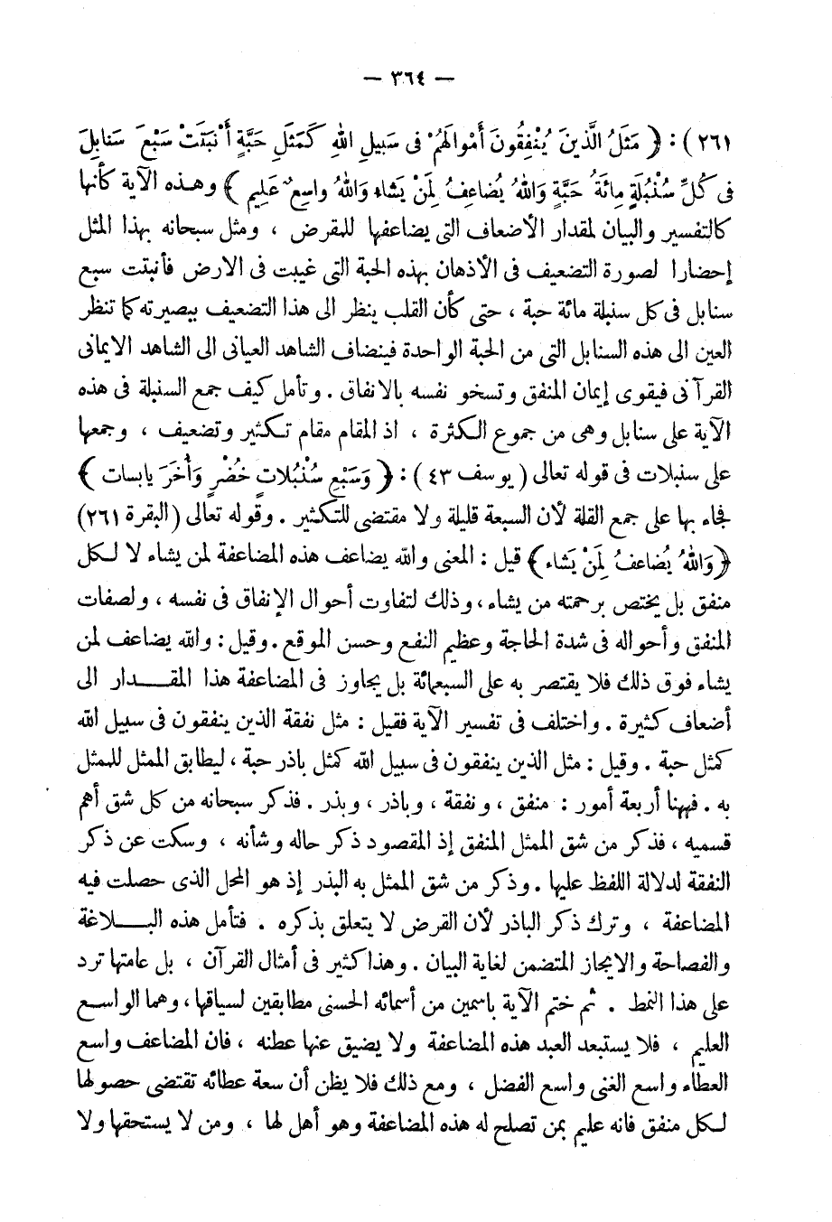 واختلف فى تفسير الآية فقيل: مثل نفقة الذين ينفقون فى سبيل الله كمثل حبة. وقيل: مثل الذين ينفقون فى سبيل الله كمثل باذر حبة، ليطابق الممثل للممثل به. [فها هنا] أربعة أُمور: منفق، ونفقة، وباذر، وبذر. فذكر سبحانه من كل شق أهم قسميه، فذكر من شق الممثل المنفق إذ المقصود ذكر حاله وشأْنه، وسكت عن ذكر النفقة لدلالة اللفظ عليها. وذكر من شق الممثل به البذر إذ هو المحل الذى حصلت فيه المضاعفة، وترك ذكر الباذر لأن القرض لا يتعلق بذكره.