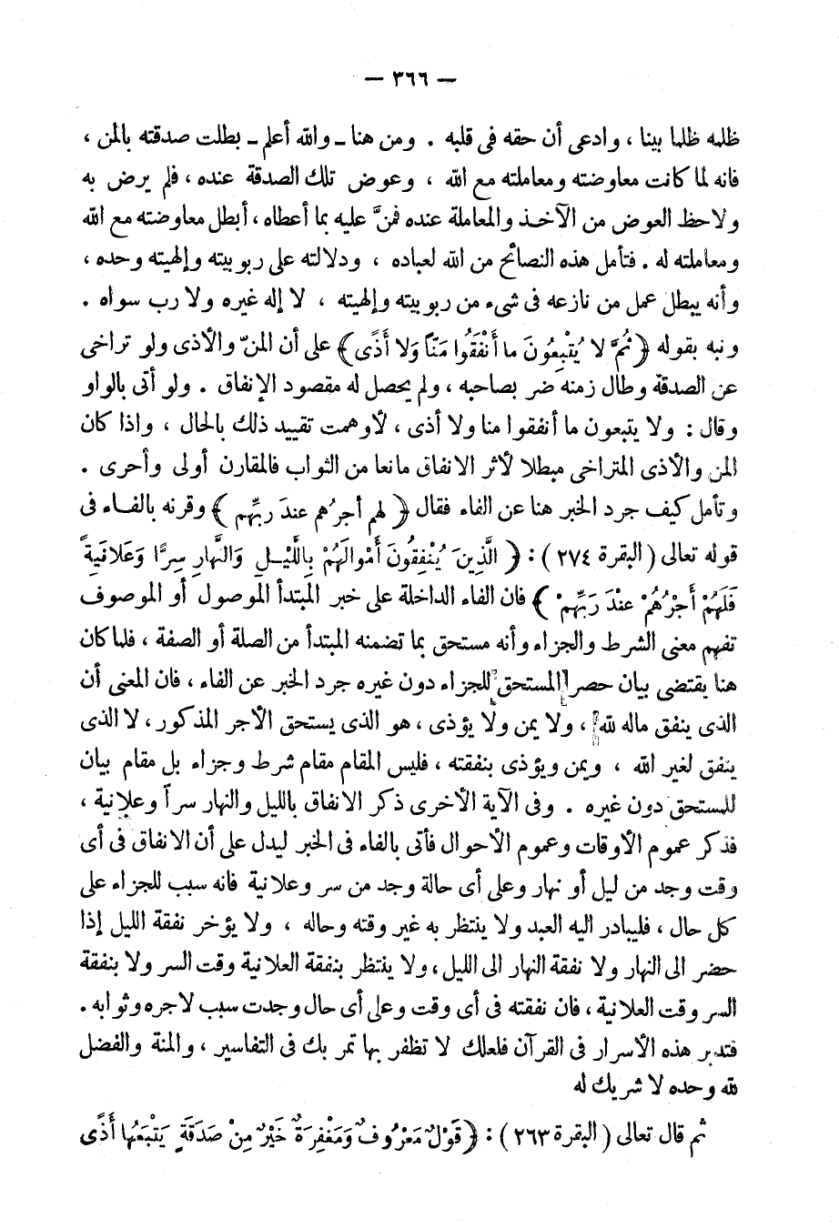 فتأمل هذه النصائح من الله لعباده، ودلالته على ربوبيته وإلهيته وحده، وأنه يبطل عمل من نازعه فى شيء من ربوبيته وإلهيته لا إله غيره ولا رب سواه ونبه بقوله: {ثُمَّ لا يُتْبِعُونَ مَا أَنْفَقُوا مَنّاً وَلا أَذَى} [البقرة: 262] ، على أن المنَّ والأذى ولو تراخى عن الصدقة وطال زمنه ضر بصاحبه ولم يحصل له مقصود الإنفاق، ولو أتى بالواو وقال: ولا يتبعون ما أنفقوا منا ولا أذى، لأوهمت تقييد ذلك بالحال، وإذا كان المن والأذى المتراخى مبطلاً لأثر الإنفاق مانعاً من الثواب فالمقارن أولى وأحرى.
