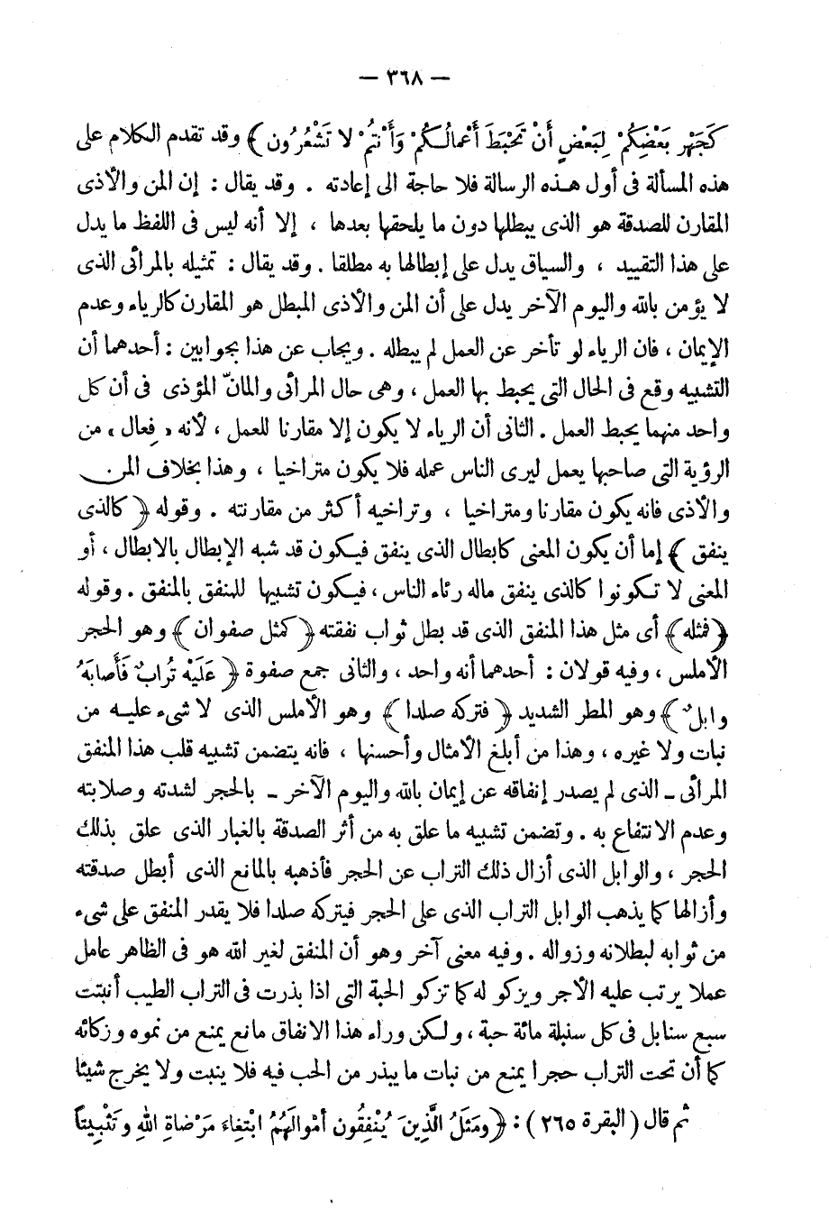 ويجاب عن هذا بجوابين: أحدهما: أن التشبيه وقع فى الحال التى يحبط بها العمل، وهى حال المرائى والمانّ المؤذى فى أن كل واحد منهما يحبط العمل. الثانى: أن الرياءَ لا يكون إلا مقارناً للعمل، لأنه "فعال" من الرؤية التى صاحبها يعمل ليرى الناس عمله فلا يكون متراخياً، وهذا [خلاف] المن والأذى فإنه يكون مقارناً ومتراخياً، وتراخيه أكثر من مقارنته.