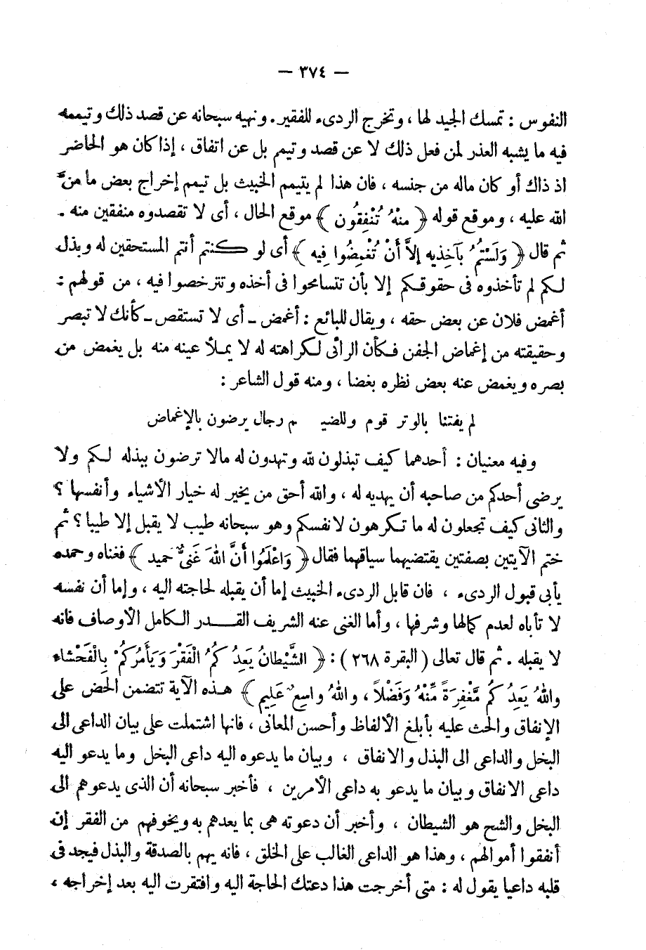 ثم قال تعالى: {الشَّيْطَانُ يَعِدُكُمُ الْفَقْرَ وَيأْمُرُكُمْ بِالْفَحَشَاءِ وَاللهِ يَعِدُكُمْ مَّغْفِرَةً مِّنْهُ وَفَضْلاً وَاللهُ وَاسِعٌ عَلِيمٌ} [البقرة: 268] هذه الآية تتضمن الحض على الإنفاق والحث عليه بأبلغ الألفاظ وأحسن المعانى، فإنها اشتملت على بيان الداعى إلى البخل والداعى إلى البذل والإنفاق، وبيان ما يدعوه إليه داعى البخل وما يدعو إليه داعى الإنفاق وبيان ما يدعو به داعى الأمرين.
