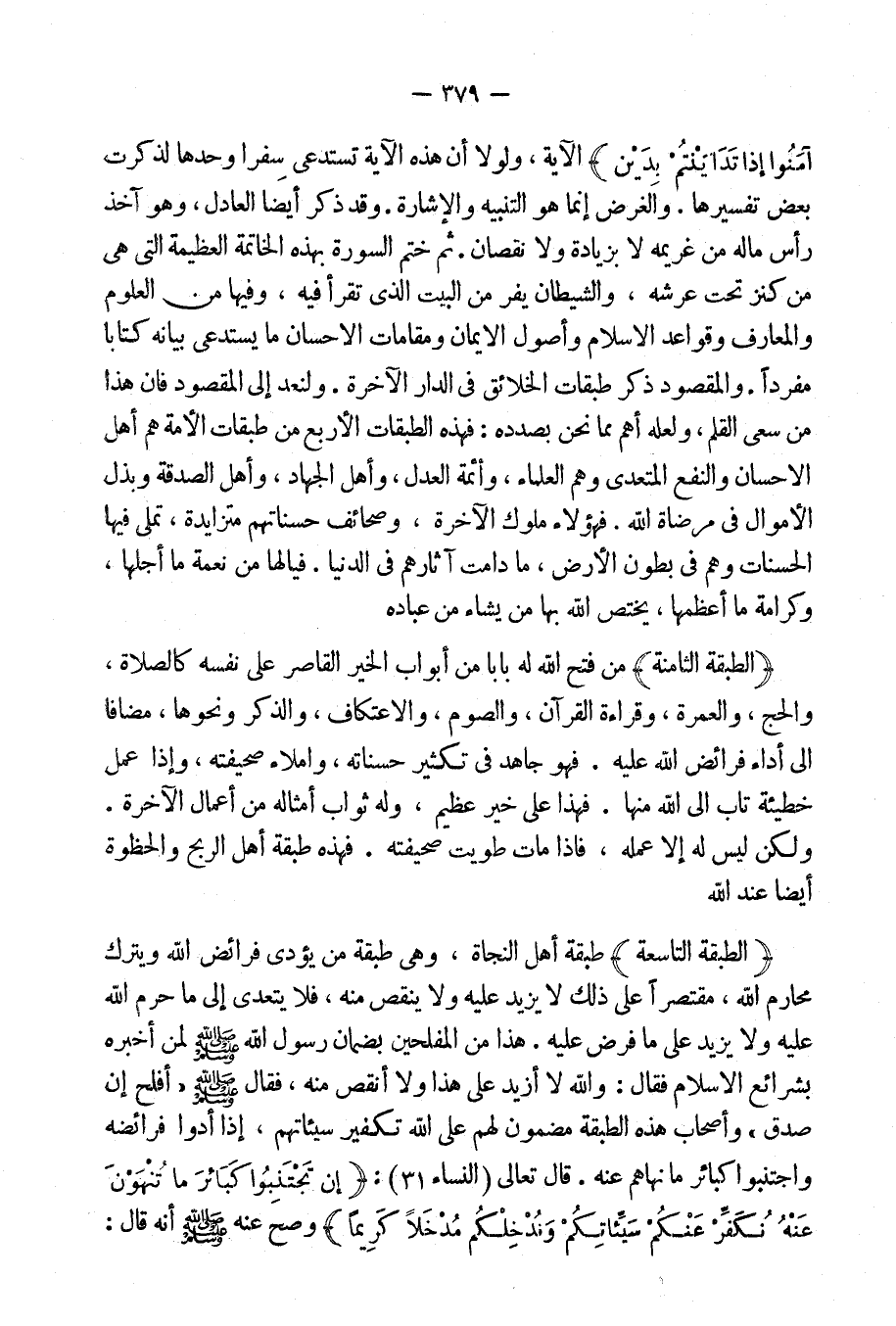الطبقة التاسعة: طبقة أهل النجاة، وهى طبقة من يؤدى فرائض الله ويترك محارم الله، مقتصراً عل ذلك لا يزيد عليه ولا ينقص منه. فلا يتعدى إلى ما حرم الله عليه، ولا يزيد على ما فرض عليه.