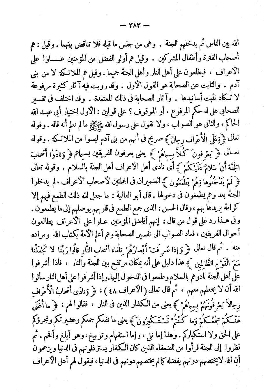 وقد اختلف فى تفسير الصحابى هل له حكم المرفوع، أو الموقوف؟ على قولين: الأول اختيار أبى عبد الله الحاكم، والثانى هو الصواب، ولا نقول على رسول الله صلى الله عليه وسلم ما لم نعلم أنه قاله. وقوله تعالى: {وَعَلَى الأَعْرَافِ رِجَالٌ} [الأعراف: 46] صريح فى أنهم من بنى آدم ليسوا من الملائكة. وقوله تعالى: {يَعْرِفُونَ كُلا بِسِيمَاهُمْ} [الأعراف: 46] ، يعنى يعرفون الفريقين بسيماهم، {وَنَادوْا أَصْحَابَ الْجَنَّةِ أَن سَلامٌ عَلَيْكُمْ} [الأعراف: 46] ، أى نادى أهل الأعراف أهل الجنة بالسلام. قوله تعالى: {لَمْ يَدْخُلُوهَا وَهُمْ يَطمَعُونَ} الضميرات فى الجملتين لأصحاب الأعراف لم يدخلوا الجنة بعد وهم يطمعون فى دخولها.