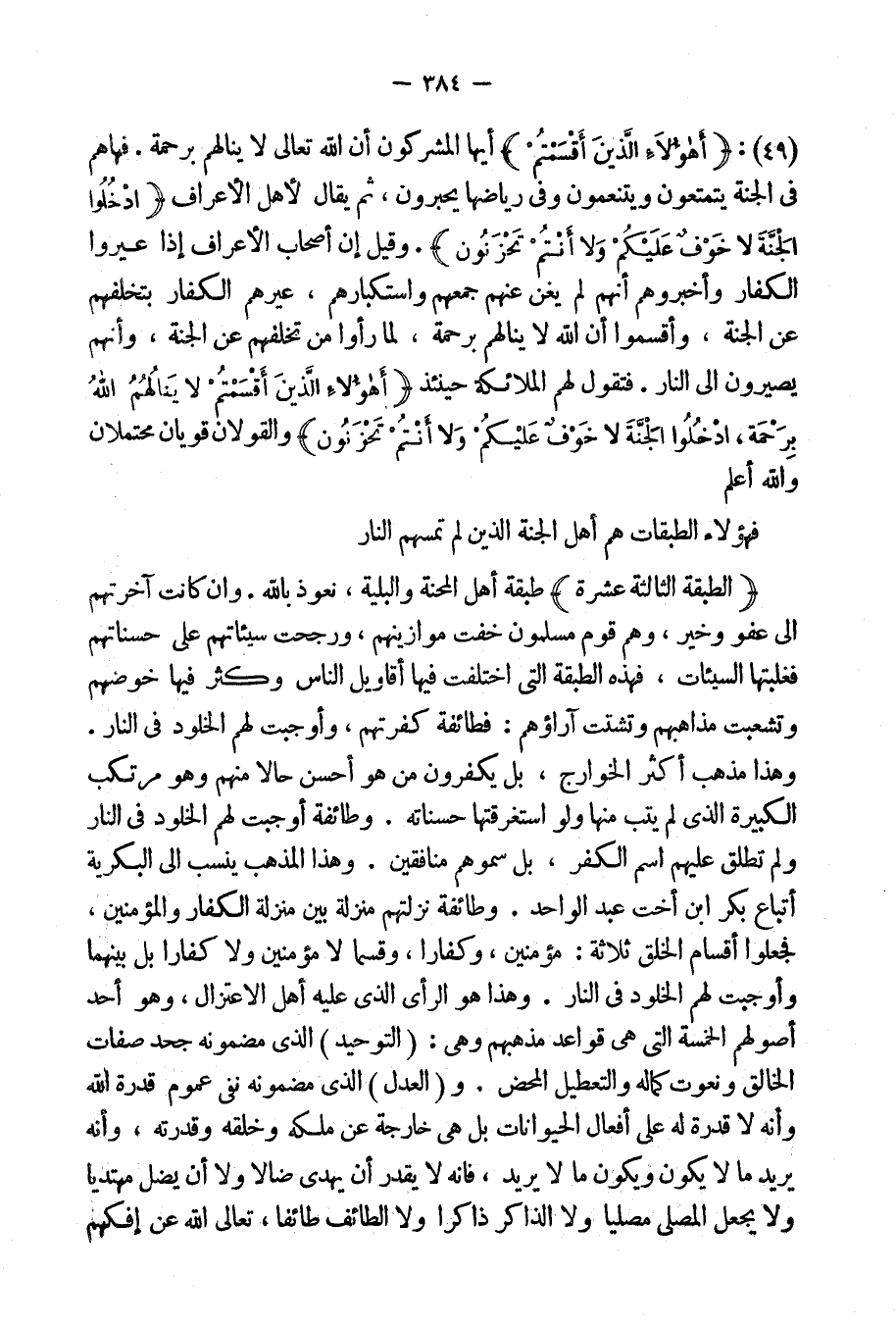 وطائفة نزلتهم منزلة بين منزلة الكفار والمؤمنين، فجعلوا أقسام الخلق ثلاثة: مؤمنين، وكفاراً، وقسماً لا مؤمنين ولا كفاراً بل بينهما، وأوجبت لهم الخلود فى النار، وهذا هو الرأى الذى عليه أهل الاعتزال، وهو أحد أُصولهم الخمسة التى هى قواعد مذهبهم وهى: التوحيد الذى مضمونه جحد صفات الخالق ونعوت كماله والتعطيل المحض، والعدل الذى مضمونه نفى عموم قدرة الله وأنه لا قدرة له على أفعال الحيوانات بل هى خارجة عن ملكه وخلقه وقدرته، وأنه يريد ما لا يكون ويكون ما لا يريد، فإنه لا يقدر أن يهدى ضالاً ولا أن يضل مهتدياً ولا يجعل المصلى مصلياً ولا الذاكر ذاكراً ولا الطائف طائقاً، تعالى الله عن إفكهم
