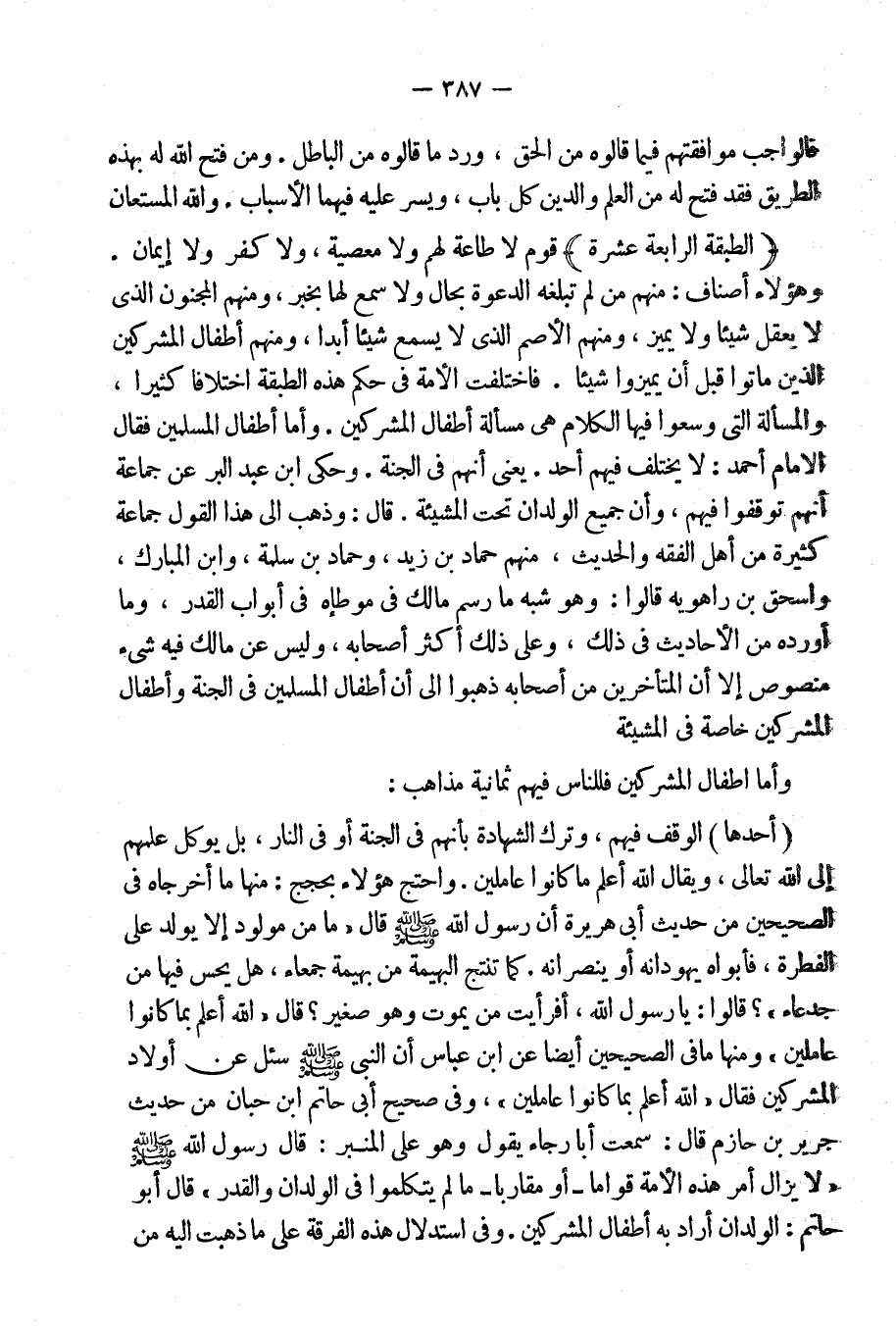 فاختلفت الأُمة فى حكم هذه الطبقة اختلافاً كثيراً، والمسألة التى وسعوا فيها الكلام هى مسألة أطفال المشركين. وأما أطفال المسلمين فقال الإمام أحمد: لا يختلف فيهم أحد [يعنى] أنهم فى الجنة. وحكى ابن عبد البر عن جماعة: أنهم توقفوا فيهم، وأن جميع الولدان تحت المشيئة قال: وذهب إلى هذا القول جماعة كثيرة من أهل الفقه والحديث منهم حماد بن زيد، وحماد بن سلمة، وابن المبارك، وإسحاق ابن راهويه قالوا: وهو شبه ما رسم مالك فى موطئه فى أبواب القدر، وما أورده من الأحاديث فى ذلك. وعلى أكثر أصحابه، وليس عن مالك فيه شيء منصوص إلا أن المتأخرين من أصحابه ذهبوا إلى أن أطفال المسلمين فى الجنة وأطفال المشركين خاصة فى المشيئة.