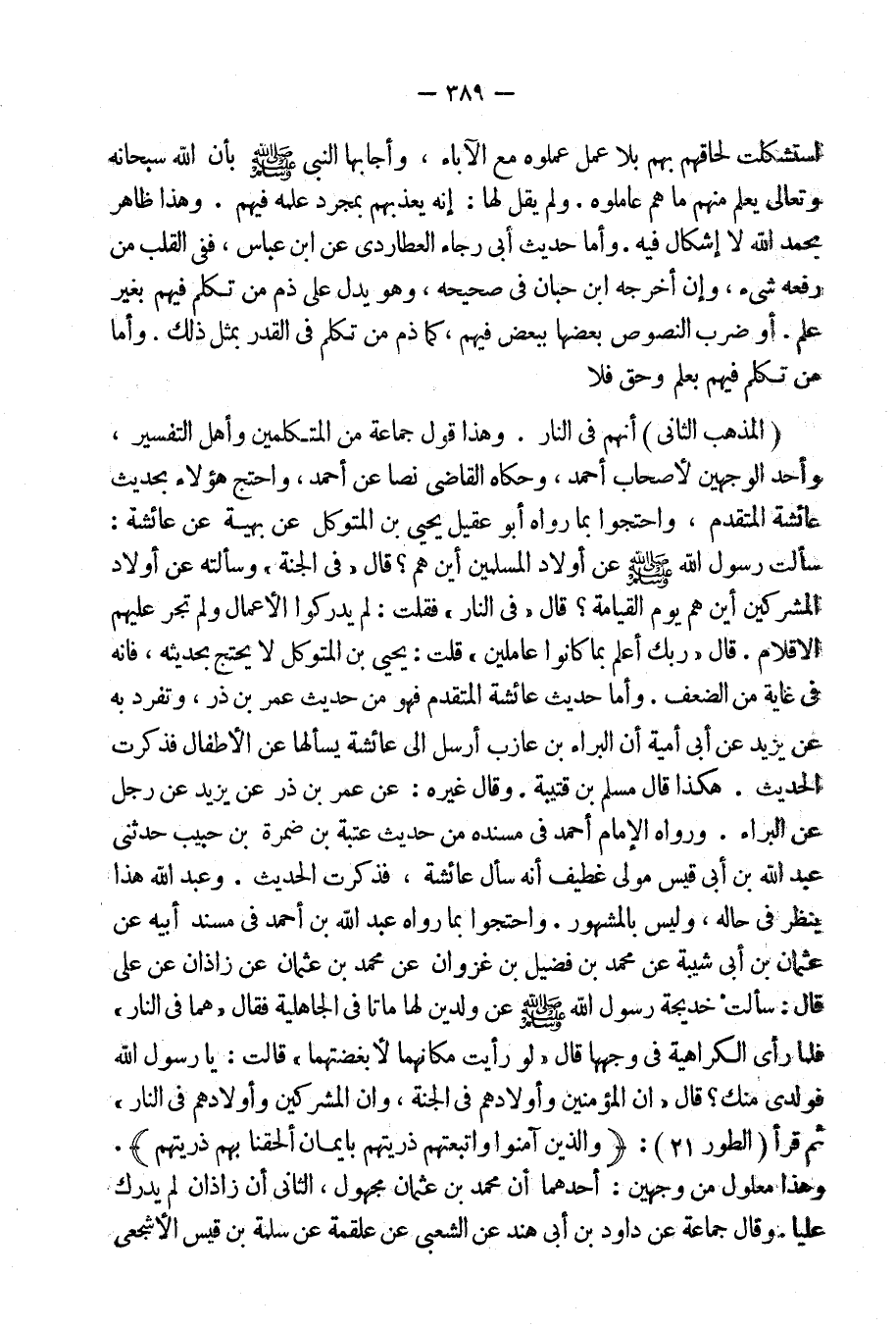 المذهب الثانى: أنهم فى النار. وهذا قول جماعة من المتكلمين وأهل التفسير، وأحد الوجهين لأصحاب أحمد، وحكاه القاضى نصاً عن أحمد، واحتج هؤلاءِ بحديث عائشة المتقدم، واحتجوا بما رواه أبو عقيل يحيى بن المتوكل عن بهية عن عائشة: سألت رسول الله صلى الله عليه وسلم عن أولاد المسلمين أين هم؟ قال: "فى الجنة"، وسألته عن أولاد المشركين أين هم يوم القيامة؟ قال: "فى النار"، فقلت: لم يدركوا الأعمال ولم تجر عليهم الأقلام. قال: "ربك أعلم بما كانوا عاملين"، قلت: يحيى بن المتوكل لا يحتج بحديثه، فإنه فى غاية من الضعف.