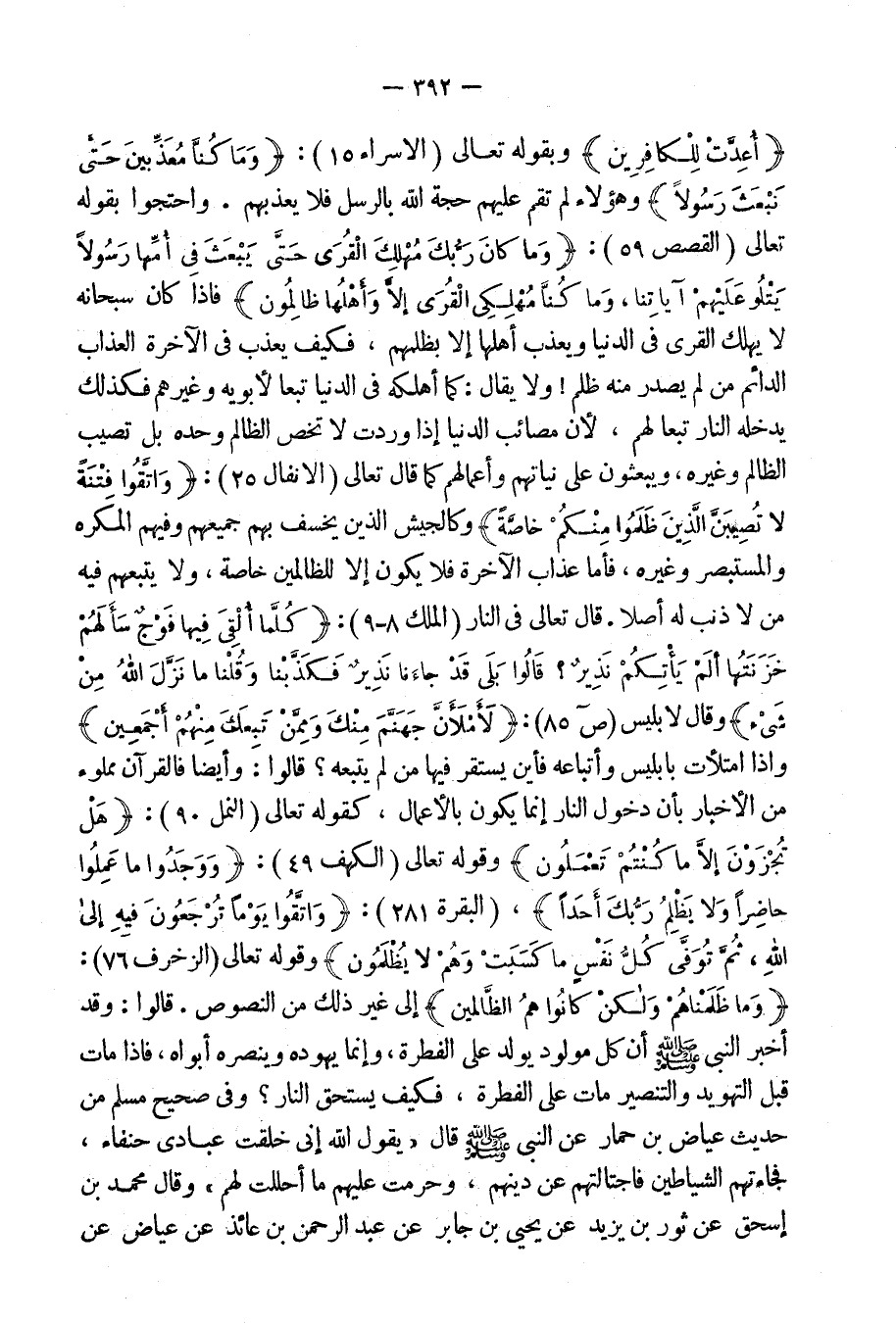 واحتجوا بقوله تعالى: {وَمَا كَانَ رَبُّكَ مُهْلِكَ الْقُرَى حَتَّى يَبْعَثُ فِى أُمّهَا رَسُولاً يَتْلُو عَلَيْهِمْ آيَاتِنَا، وَمَا كُنَّا مُهْلِكِى الْقُرَى إِلا وَأَهْلُهَا ظَالِمُونَ} [القصص:95] ، فإذا كان سبحانه لا يهلك القرى فى الدنيا ويعذب أهلها إلا بظلمهم، فكيف يعذب فى الآخرة العذاب الدائم من لم يصدر منه ظلم؟ ولا يقال: كما أهلكه فى الدنيا تبعاً لأبويه وغيرهم، [فكذلك] يدخله النار تبعاً لهم، لأن مصائب الدنيا إذا وردت لا تخص الظالم وحده بل تصيب الظالم وغيره ويبعثون على نياتهم وأعمالهم كما قال تعالى: {وَاتَّقُوا فِتْنَةً لا تُصِيبَنَّ الَّذِينَ ظَلَمُوا مِنكُمْ خَاصَّةٍ} [الأنفال: 25] ، وكالجيش الذى يخسف بهم جميعهم وفيهم المكره والمستبصر وغيره.