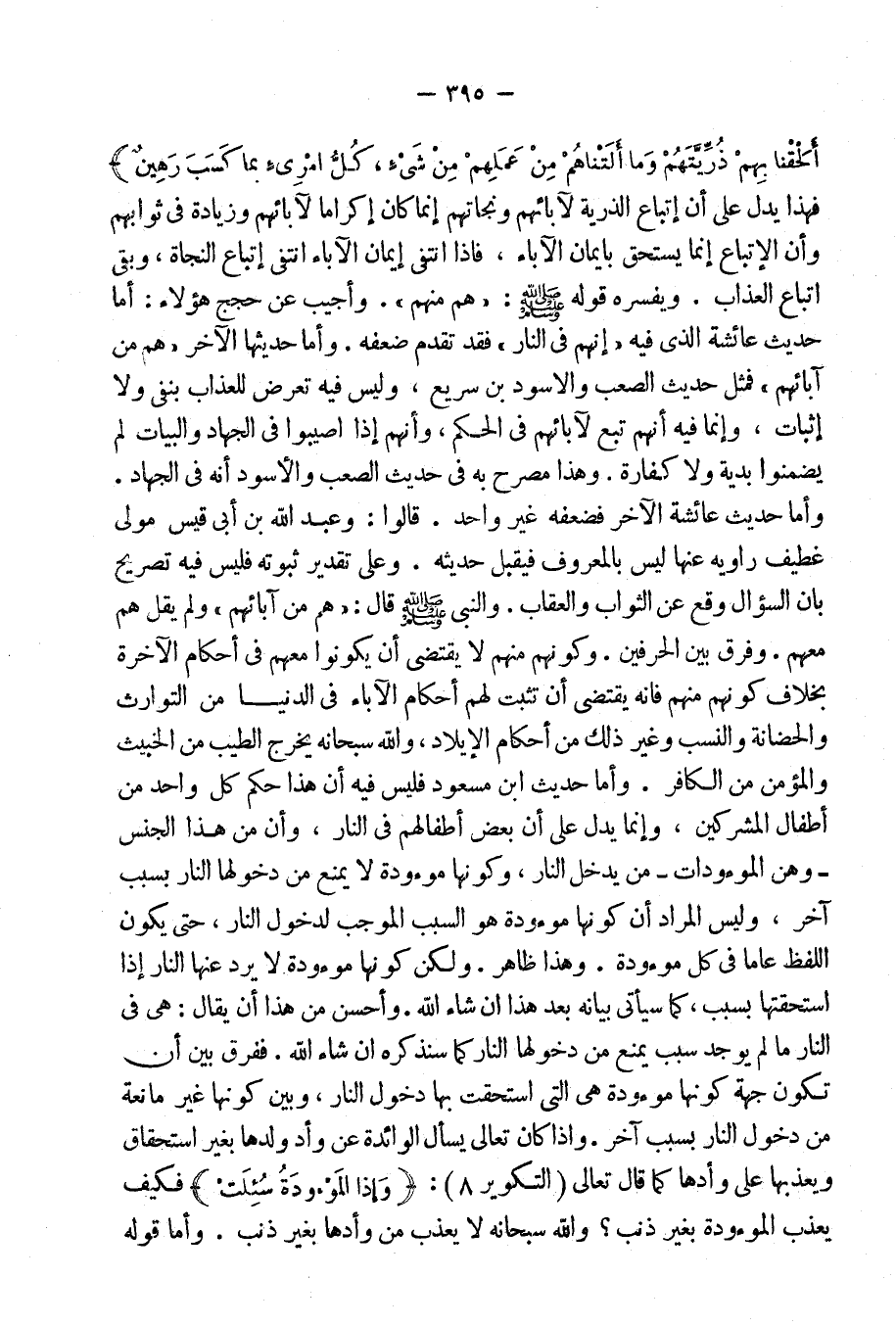 وأما حديث ابن مسعود فليس فيه أن هذا حكم كل واحد من أطفال المشركين وإنما يدل على أن بعض أطفالهم فى النار، وأن من هذا الجنس- وهن المؤودات- من يدخل النار، وكونها موؤودة [لا يمنع من دخولها النار بسبب آخر وليس المراد أن كونها موءودة] هو السبب الموجب لدخول النار، حتى يكون اللفظ عاماً فى كل موؤدة وهذا ظاهر [ولكن كونها موءودة لا يرد عنها النار إذا استحقتها بسبب] ، كما سيأْتى بيانه بعد هذا إن شاء الله. وأحسن من هذا أن يقال: هى فى النار ما لم يوجد سبب يمنع من دخولها النار كما سنذكره إن شاء الله. ففرق بين أن تكون جهة كونها موؤدة هى التى استحقت بها دخول النار، وبين كونها غير مانعة من دخول النار بسبب آخر، وإذا كان تعالى يسأَل [الوائدة] عن وأْد ولدها بغير استحقاق ويعذبها على وأْدها كما قال تعالى: {وَإِذَا المَوءودةُ سُئلَتْ} [التكوير:8] ، فكيف يعذب الموءودة بغير ذنب؟ والله سبحانه لا يعذب من وأَدها بغير ذنب. وأما قوله