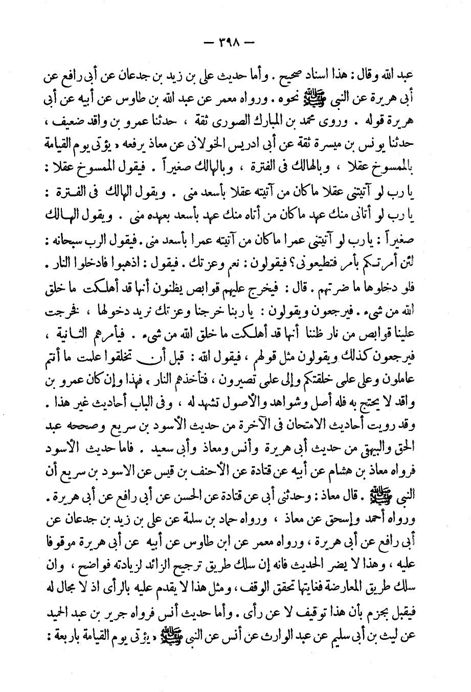 وروى محمد بن المبارك الصورى ثقة، حدثنا عمرو بن واقد ضعيف، حدثنا يونس بن ميسرة ثقة عن أبى إدريس الخولانى عن معاذ يرفعه: "يؤتى يوم القيامة بالممسوخ عقلاً، وبالهالك فى الفترة، وبالهالك صغيراً. فيقول الممسوخ عقلاً: يا رب لو آتيتنى عقلاً ما كان مَن آتيته عقلاً بأسعد منى، ويقول الهالك فى الفترة: يا رب لو آتانى منك عهد ما كان من آتاه منك عهد بأسعد بعهده منى، منى، فيقول الرب سبحانه: لئن أمرتكم بأمر فتطيعونى؟ فيقولون: نعم وعزتك فيقول: اذهبوا فادخلوا النار، فلو دخلوها ما ضرتهم قال: فيخرج عليهم قوابص يظنون أنها قد أهلكت ما خلق الله من شيء فيأمرهم الثانية، فيرجعون كذلك ويقولون: يا ربنا خرجنا وعزتك نريد دخولها، فخرجت علينا قوابص من نار ظننا أنها قد أهلكت ما خلق الله من شيء، فيأْمرهم الثانية فيرجعون كذلك ويقولون مثل قولهم، فيقول الله: قبل أن تخلقوا علمت ما أنتم عاملون وعلى علمى خلقتكم وإلى علمى تصيرون، فتأْخذهم النار"، فهذا وإن كان عمرو بن واقد لا يحتج به، فله أصل وشواهد والأُصول تشهد له.