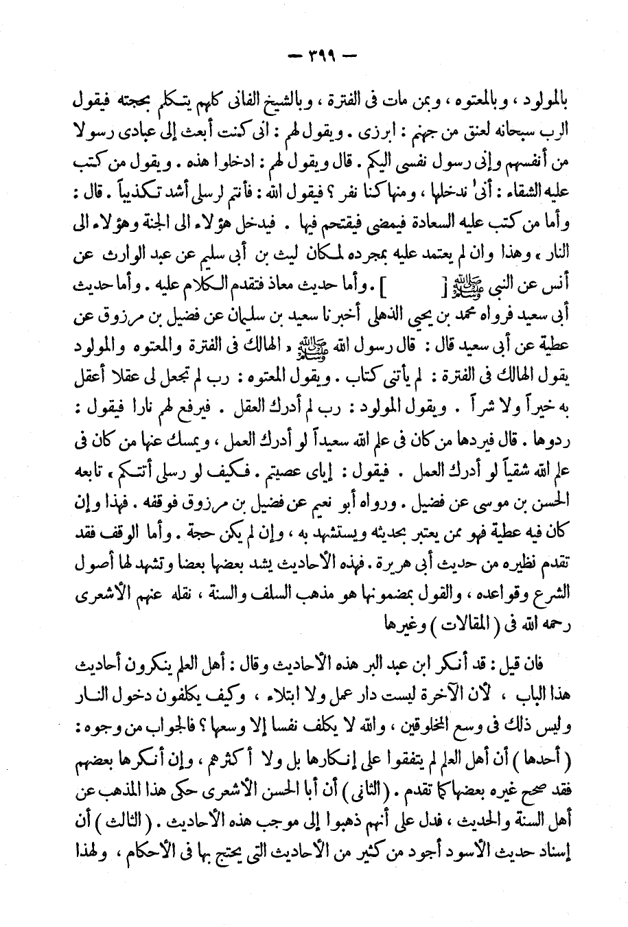 وهذا وإن لم يعتمد عليه بمجرده لمكان ليث بن أبى سليم عن عبد الوارث عن أنس عن النبى صلى الله عليه وسلم [وأما حديث معاذ فتقدم الكلام عليه. وأما حديث أبى سعيد فرواه محمد بن يحيى الذهلى: أخبرنا سعيد بن سليمان عن فضيل بن مرزوق عن عطية عن أبى سعيد قال: قال رسول الله صلى الله عليه وسلم: "الهالك فى الفترة والمعتوه والمولود يقول الهالك فى الفترة: لم يأْتنى كتاب، ويقول المعتوه: رب لم تجعل لى عقلاً أعقل به خيراً ولا شراً. ويقول المولود: رب لم أُدرك العقل فيرفع لهم ناراً فيقول: ردوها، قال: فيردها من كان فى علم الله سعيداً لو أدرك العمل، ويمسك عنها من كان فى علم الله شقياً لو أدرك العمل، فيقول: إياى عصيتم، فكيف لو رسلى أتتكم"، تابعه الحسن بن موسى عن فضيل. ورواه أبو نعيم عن فضيل بن مرزوق فوقفه. فهذا وإن كان فيه عطية فهو ممن يعتبر بحديثه ويستشهد به، وإن لم يكن حجة. وأما الوقف فقد تقدم نظيره من حديث أبى هريرة. فهذه الأحاديث يشد بعضها بعضاً وتشهد لها أصول الشرع وقواعده، والقول بمضمونها هو مذهب السلف والسنة نقله عنهم الأشعرى رحمه الله فى المقالات وغيرها.