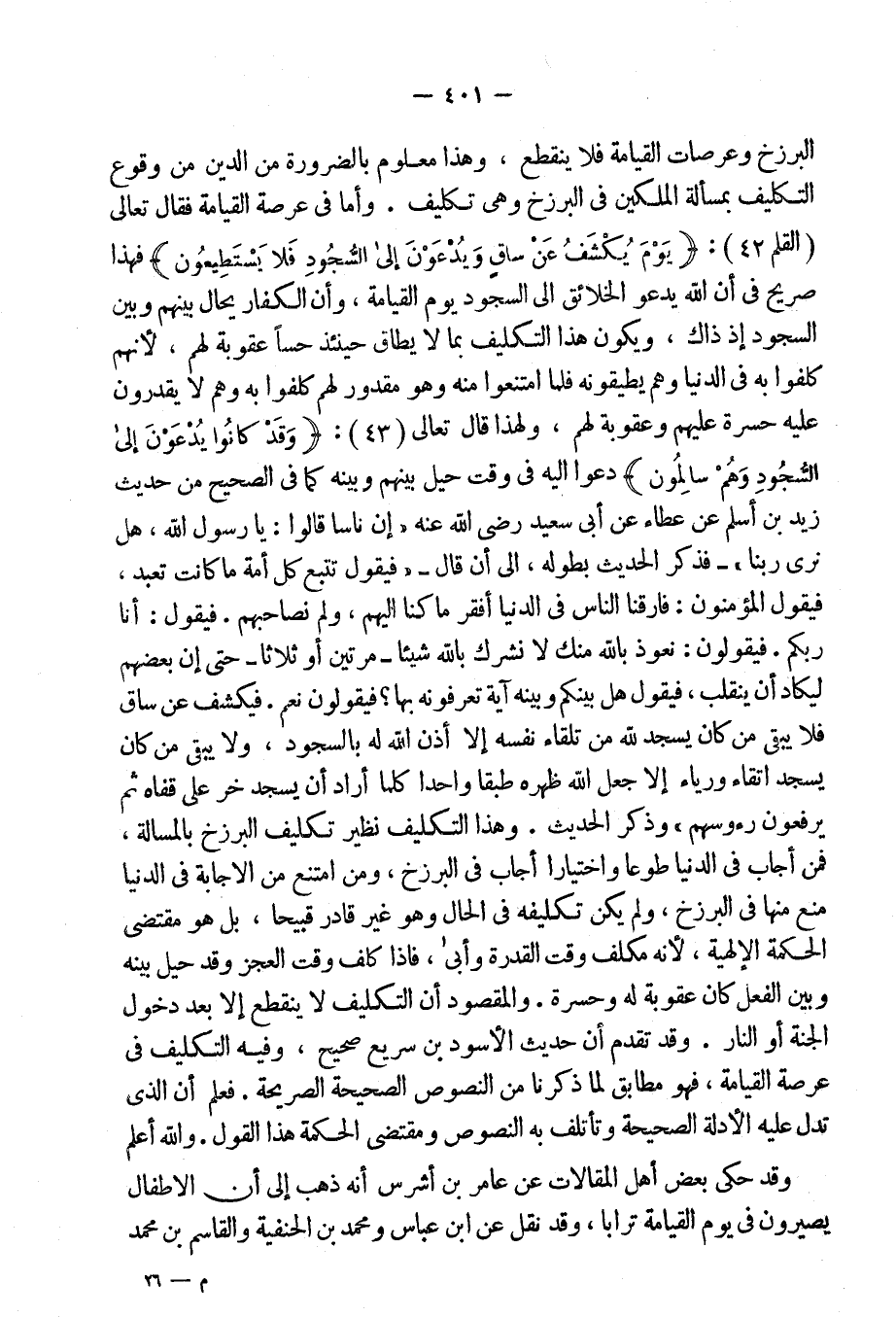 وأما فى عرصة القيامة فقال تعالى: {يَوْمَ يُكْشَفُ عَنْ سَاقٍ وَيُدْعَوْنَ إِلَى السُّجُودِ فَلا يَسْتَطِيعُونَ} [القلم: 42] ، [فهذا] صريح فى أن الله يدعو الخلائق إلى السجود يوم القيامة، وأن الكفار يحال بينهم وبين السجود إذ ذاك، ويكون هذا التكليف، بما لا يطاق حينئذ حساً عقوبة لهم، لأنهم كلفوا به فى الدنيا وهم يطيقونه فلما امتنعوا منه وهو مقدور لهم كلفوا به وهم لا يقدرون عليه حسرة عليهم وعقوبة لهم، ولهذا قال تعالى: {وَقدْ كَانُوا يُدْعَوْنَ إِلَى السُّجُودِ وَهُمْ سَالِمُونَ} [القلم: 43] [يعنى أصحابه لا أحد يمنعهم منه فلما تركوه وهم سالمون] دعوا إليه فى وقت حيل بينهم وبينه كما فى الصحيح من حديث زيد ابن أسلم عن عطاء عن أبى سعيد رضى الله عنه: "إن ناساً قالوا: يا رسول الله، هل نرى ربنا"- فذكر الحديث بطوله، إلى أن قال- "فيقول تتبع كل أُمه ما كانت تعبد فيقول المؤمنون: فارقنا الناس فى الدنيا أفقر ما كنا إليهم، ولم نصاحبهم. فيقول: أنا ربكم. فيقولون: نعوذ بالله منك لا نشرك بالله شيئاً- مرتين أو ثلاثاً- حتى إن بعضهم ليكاد أن ينقلب فيقول هل بينكم وبينه آية تعرفونه بها" فيقولون نعم، فيكشف عن ساق فلا يبقى من كان يسجد تلقاء نفسه إلا أذن الله له بالسجود، ولا يبقى من كان يسجد اتقاءً ورياءً إلا جعل الله ظهره:" [طبقة] واحدة كلما أراد أن يسجد خر على قفاه ثم يرفعون رؤوسهم" وذكر الحديث.