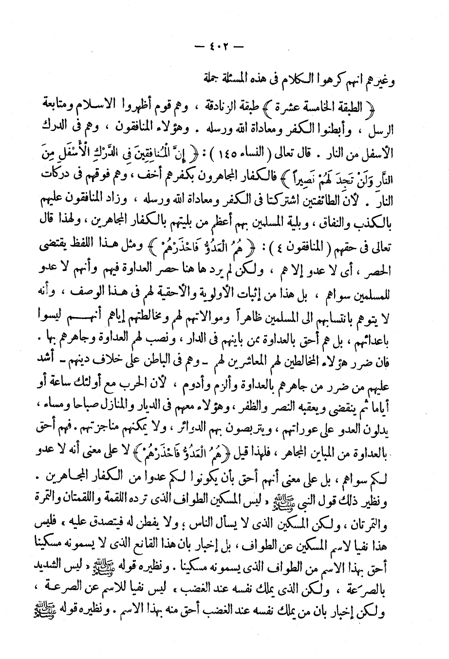 الطبقة الخامسة عشرة: طبقة الزنادقة، وهم قوم أظهروا الإسلام ومتابعة الرسل، وأبطنوا الكفر ومعاداة الله [ورسوله] . وهؤلاء المنافقون، وهم فى الدرك الأسفل من النار، قال تعالى: {إِنَّ المُنَافِقِينَ فِى الدَّرْكِ الأَسْفَلِ مِنَ النَّارِ، وَلَن تَجِدَ لَهُمْ نَصِيراً} [النساء: 145] ، فالكفار المجاهرون بكفرهم أخف، وهم فوقهم فى دركات النار. لأن الطائفتين اشتركتا فى الكفر ومعاداة الله ورسله وزاد المنافقون عليهم بالكذب والنفاق، وبلية المسلمين بهم أعظم من بليتهم بالكفار المجاهرين، ولهذا قال تعالى فى حقهم: {هُمُ الْعَدُوُّ فَاحْذَرْهُمْ} [المنافقون: 4] ، ومثل هذا اللفظ يقتضى الحصر، أى لا عدو إلا هم، ولكن لم يرد هاهنا [حصر العداوة فيهم وأنهم لا عدو للمسلمين سواهم بل هذا] من إثبات الأولوية والأحقية لهم فى هذا الوصف، وأنه لا يتوهم بانتسابهم إلى المسلمين ظاهراً وموالاتهم [لهم] ومخالطتهم إياهم أنهم ليسوا بأعدائهم، بل هم أحق بالعدواة ممن باينهم فى الدار، ونصب لهم العداوة وجاهرهم بها. فإن ضرر هؤلاءِ المخالطين لهم المعاشرين لهم- وهم فى الباطن على خلاف دينهم- أشد عليهم من ضرر من جاهرهم بالعداوة وألزم وأدوم، لأن الحرب مع أولئك ساعة أو أياماً ثم ينقضى ويعقبه النصر والظفر، وهؤلاء معهم فى الديار والمنازل صباحاً ومساءً، يدلون العدو على عوراتهم ويتربصون بهم الدوائر ولا يمكنهم مناجزتهم، فهم أحق بالعداوة من المباين المجاهر، فلهذا قيل: {هُمُ الْعَدُوُّ فَاحْذَرْوهُمْ} [المنافقون: 4] ، لا على معنى أنه لا عدو لكم سواهم، بل على معنى أنهم أحق بأن يكونوا لكم عدواً من الكفار المجاهرين. ونظير ذلك قول النبى صلى الله عليه وسلم: "ليس المسكين الطواف الذى ترده اللقمة واللقمتان والتمرة والتمرتان، ولكن المسكين الذى لا يسأل الناس، ولا يفطن له فيتصدق عليه"، فليس هذا نفياً لاسم المسكين عن الطواف، بل إخبار بأن هذا القانع الذى لا يسمونه مسكيناً أحق بهذا الاسم من الطواف الذى يسمونه مسكيناً.